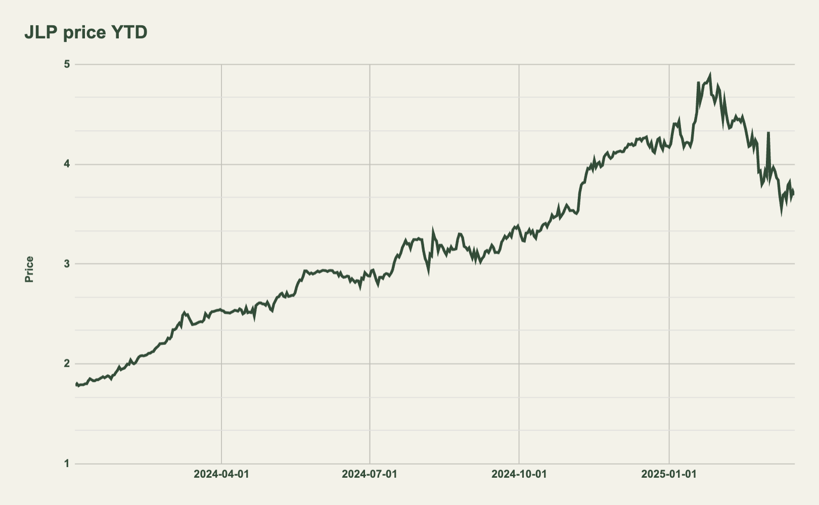Let's now look at JLP, the liquidity token powering the Jupiter perps exchange. In contrast to Hyperliquid, Jupiter doesn't use an orderbook for liquidity but rather an AMM style product (popularized by GMX). With JLP at the core of this design, the token captures 75% of all fees paid by traders. JLP consists of a basket of assets (SOL, BTC, ETH and stablecoins). The price is determined by the price action of the underlying tokens, the fees paid by traders and finally the PnL of the traders. To learn more about the design of JLP, feel free to check out the article below.