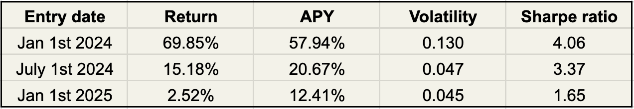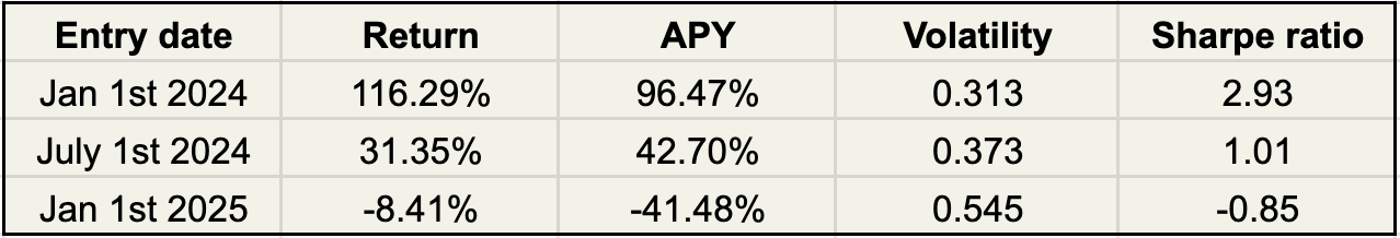 Similar to HLP, we can take a look at the returns from entering JLP at different periods. JLP has had an impressive 116% return since the beginning of 2024 which is a result of positive price action for BTC and SOL but also a large amount of fees being paid by traders to JLP throughout this period.