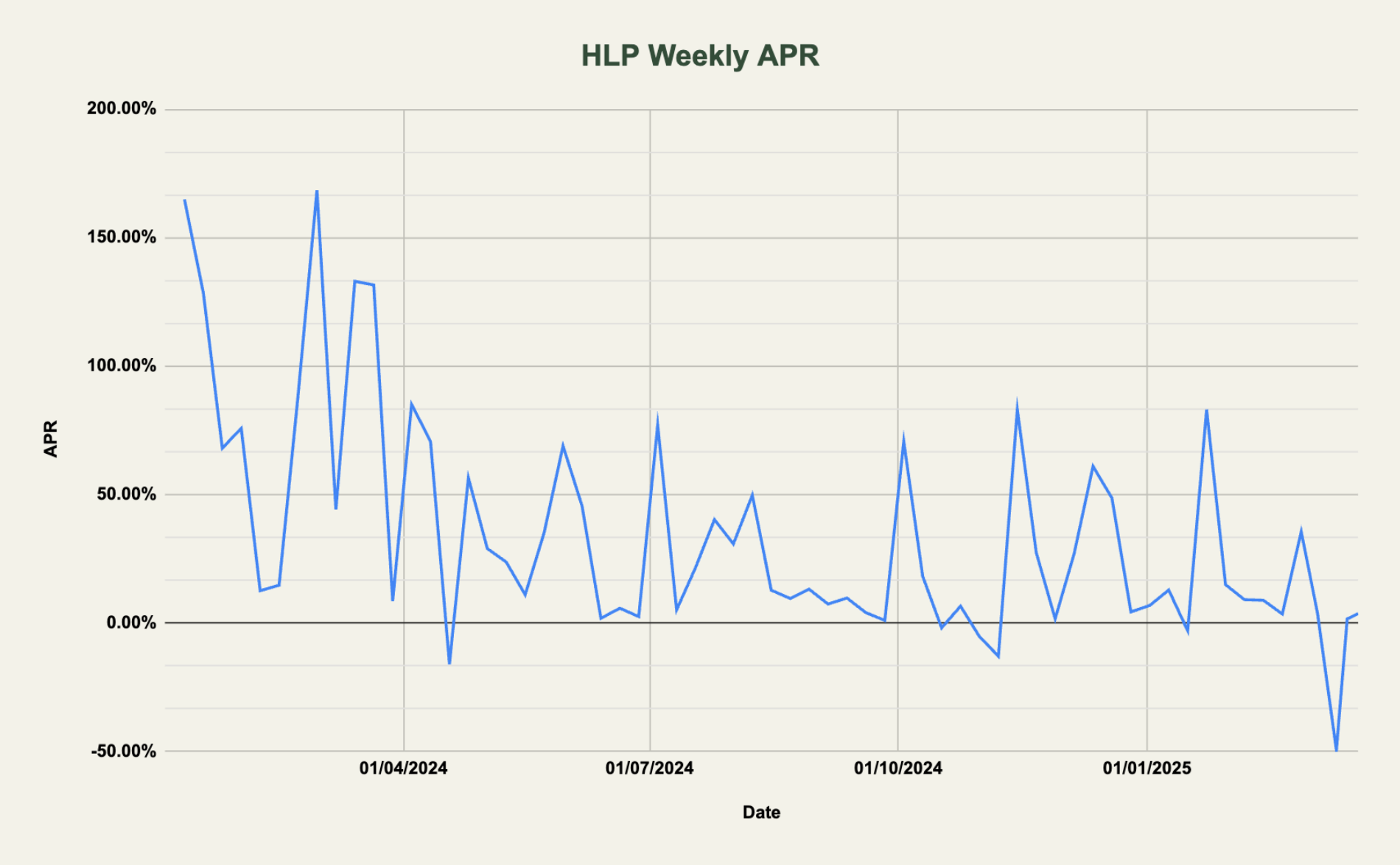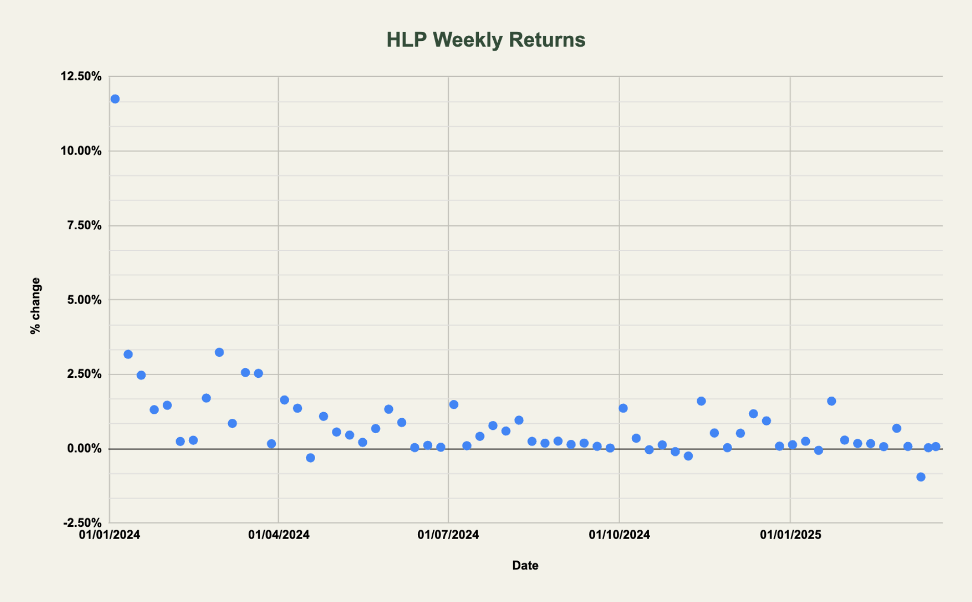This incident, however, peaked my interest and made me curious as to what returns HLP has been offering depositors since the beginning of 2024. There is little data available on HLP aside from what's displayed on the UI above. Therefore, the vault returns are aggregated on a weekly rather than daily basis which might cause slight inaccuracies (I am however fairly confident that the numbers are fairly accurate).