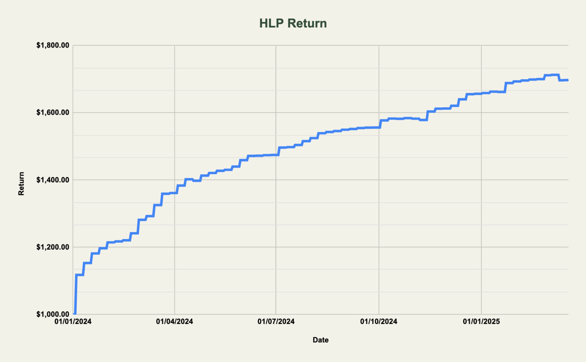 While the HLP returns have taken a haircut recently, over time the strategy is expected to do well. An example of returns compounding, the chart below shows a $1000 deposit at the beginning of 2024 which is up 70%.