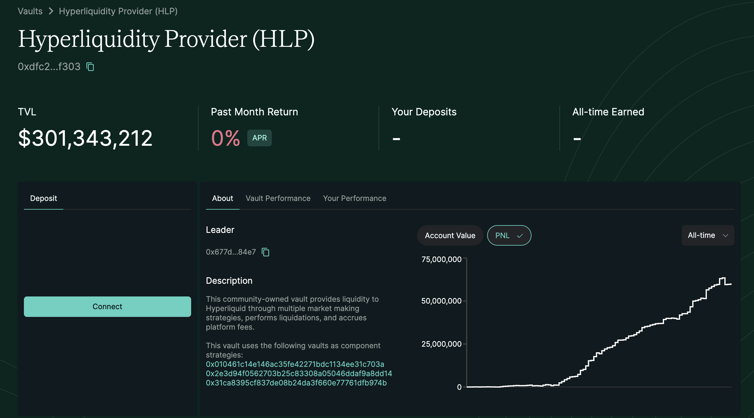 The Hyperliquidity Provider (HLP) is the largest vault on Hyperliquid and acts as the native market maker on the exchange. As per the description on the webpage: