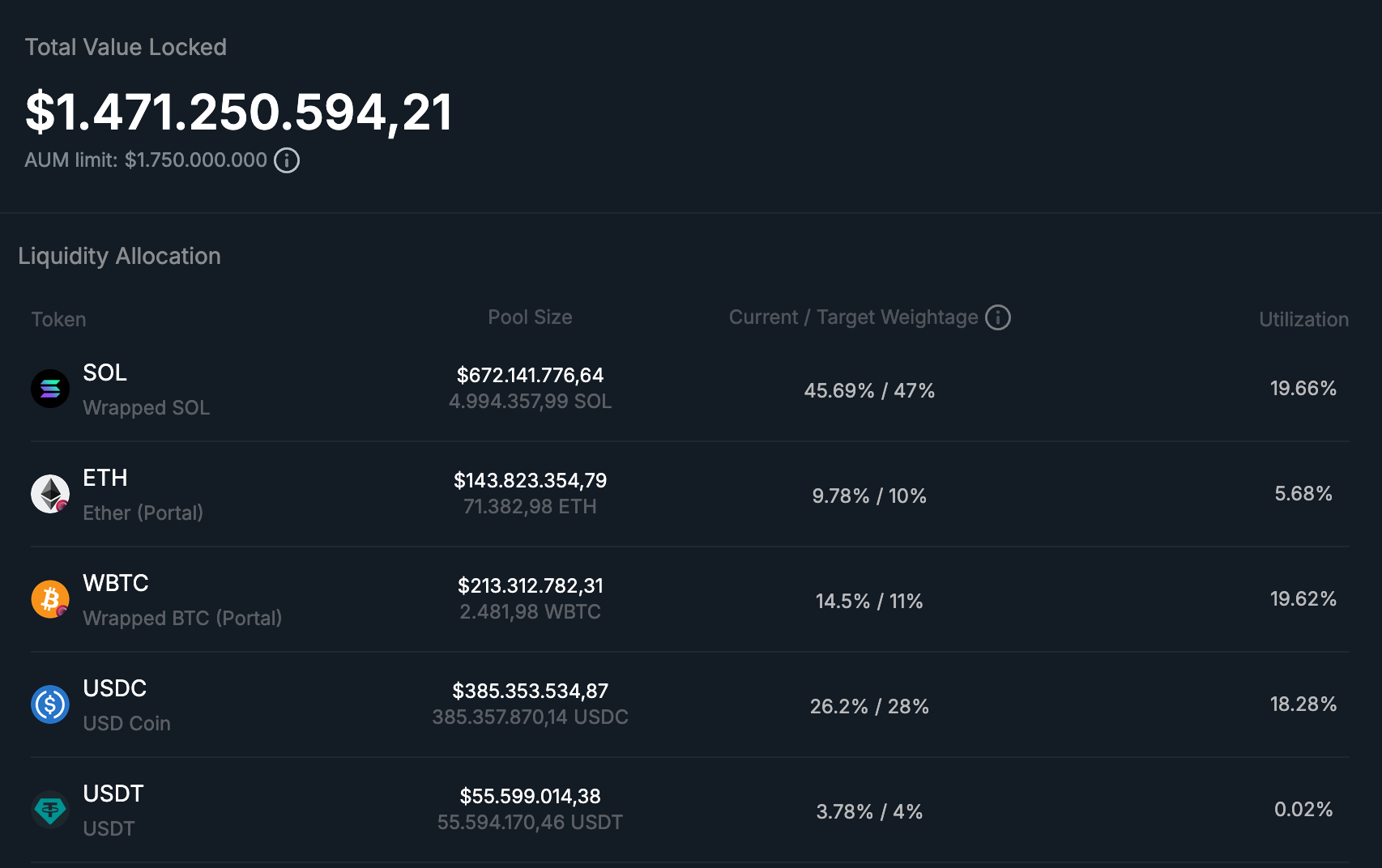JLP is down 24% from its highs earlier this year (while SOL is down 55%) which, depending on how you view it, either presents a potentially good opportunity to enter JLP at a discount or alternatively a potential end to JLPs previous impressive performance. One thing that's important to keep in mind if you're considering investing in JLP is that you are effectively taking a pretty bullish stance on SOL. For every $1 of JLP, you're effectively holding $0.45 of SOL: