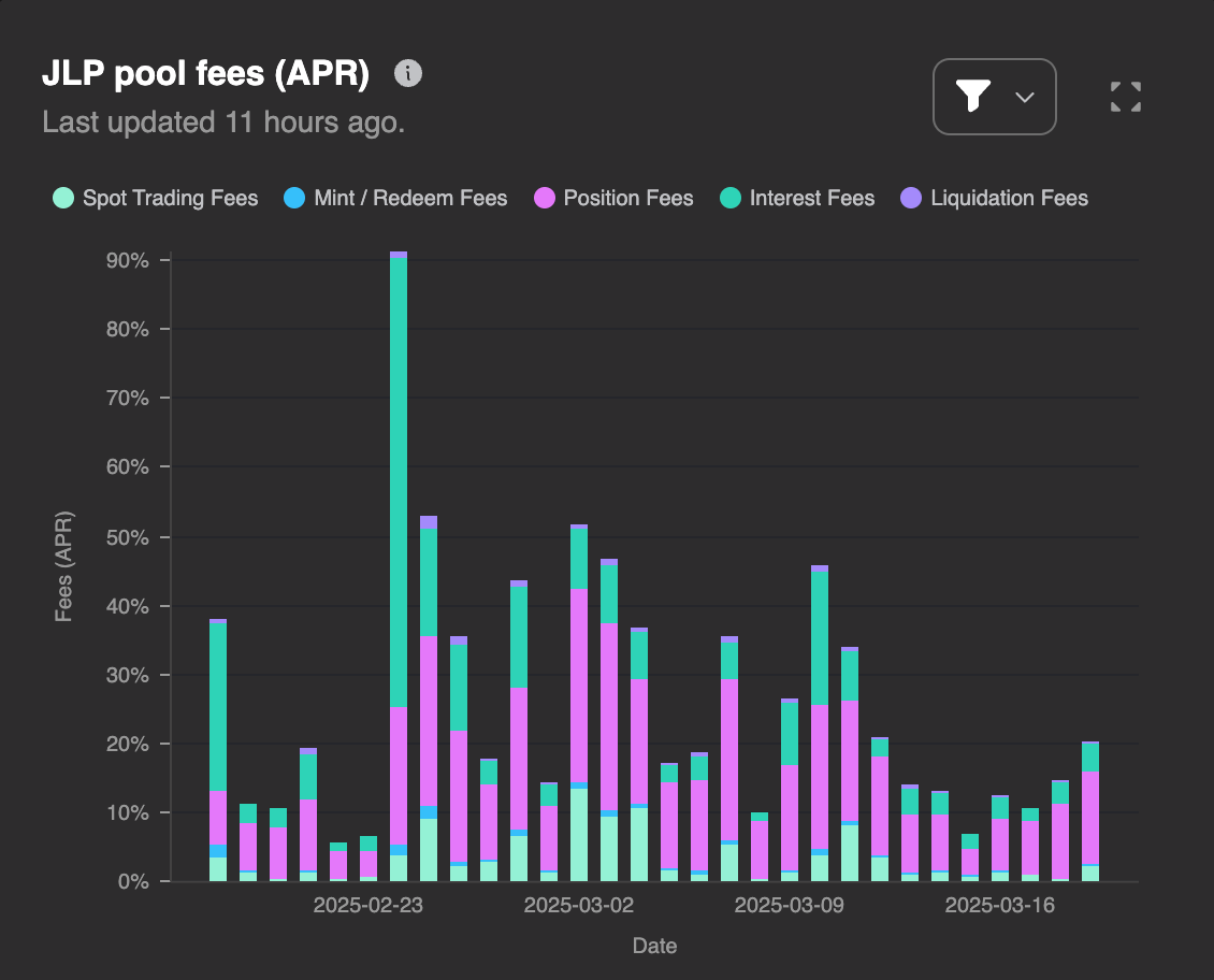 It's also worth noting that the fees APR has come down significantly from earlier this year as trading activity has cooled off across the market. The fees paid by traders have historically been a big contributor to JLP's outperformance relative to majors like BTC, ETH and SOL and is a metric you should keep track of if you hold JLP.