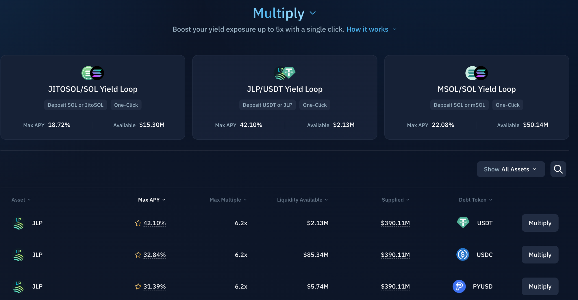 Kamino offers the best way to access leverage on your JLP by depositing it into the lending market as collateral and borrowing either USDC, USDT or PYUSD against it. Borrow rates are cheap at the moment and USDT can be borrowed at a cost of 10.17% annually. JLP is currently is earning 15%+ from fees paid by traders and looping this asset on Kamino can therefore boost the yield earned. This can be fully automated via 'Kamino Multiply' where up to 6x leverage is available. Keep in mind that the liquidation LTV is 0.85 and the more leverage the higher is the risk of liquidation.