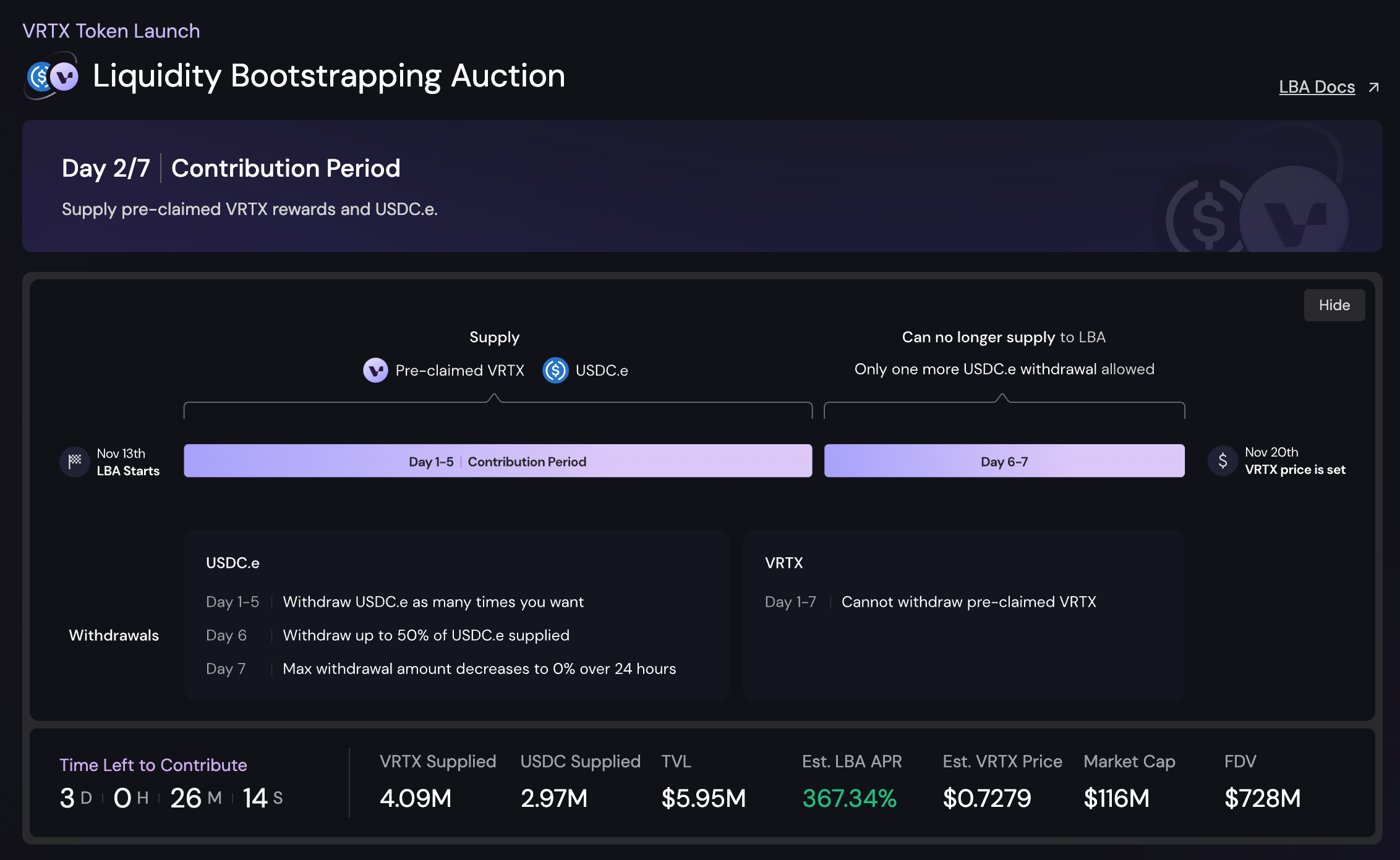 The $VRTX Liquidity-Bootstrapping Auction (LBA) is currently live till November 19th and is a novel approach for seeding initial token liquidity and distribute the early token supply to liquidity providers. In the first five days, users will be able to lock up USDC and pre-claimed VRTX which will be locked & vested over 180 days while earning VRTX tokens. For more information, see the link here.