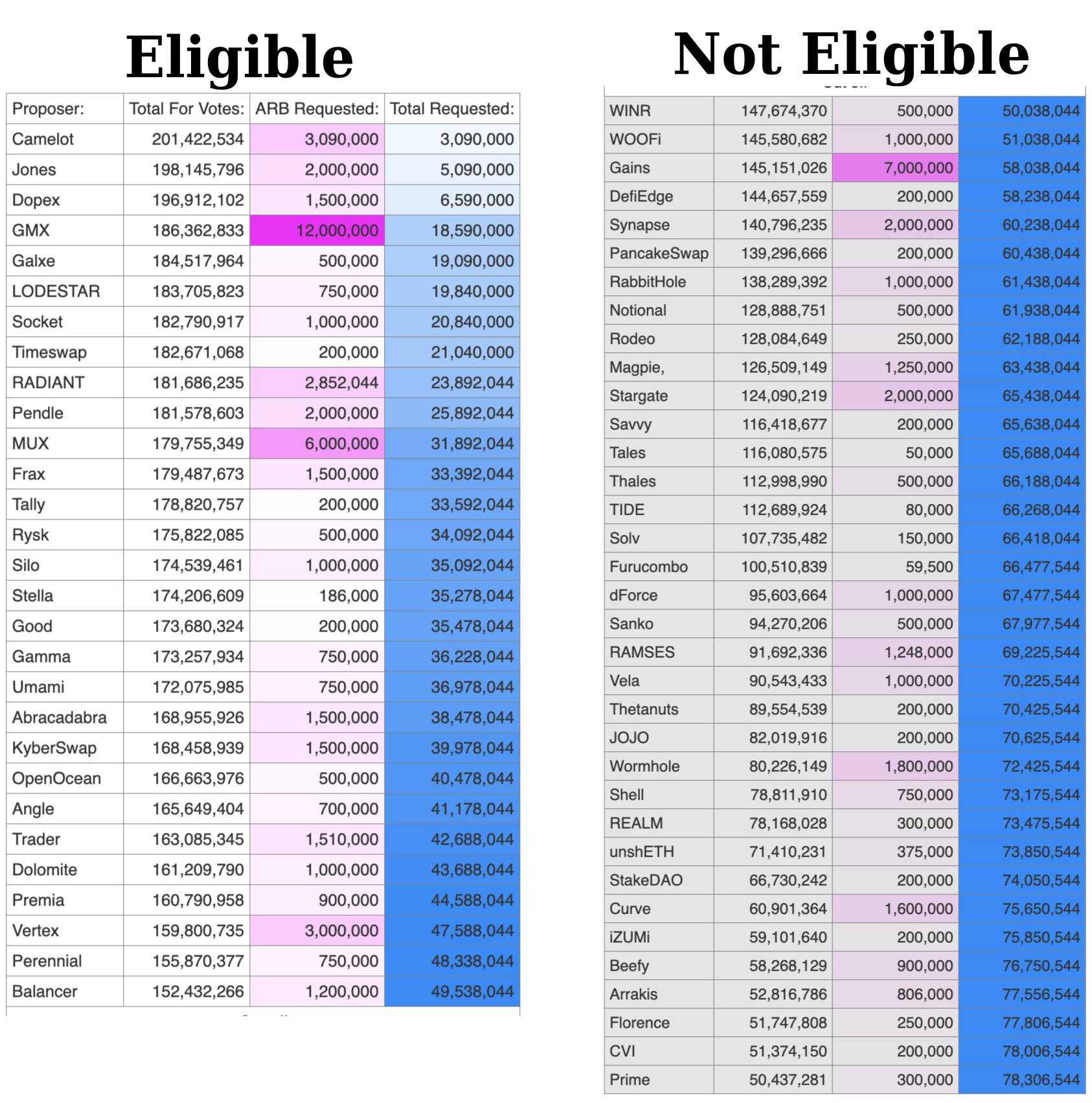 The 50m grant will be split between the protocols with the most amount of ‘for‘ votes as seen by the image above. For the protocols in the table on the right, despite having reached quorum and the majority of votes in favour for their proposal, due to the large grant demand these will not be receiving any ARB this round.