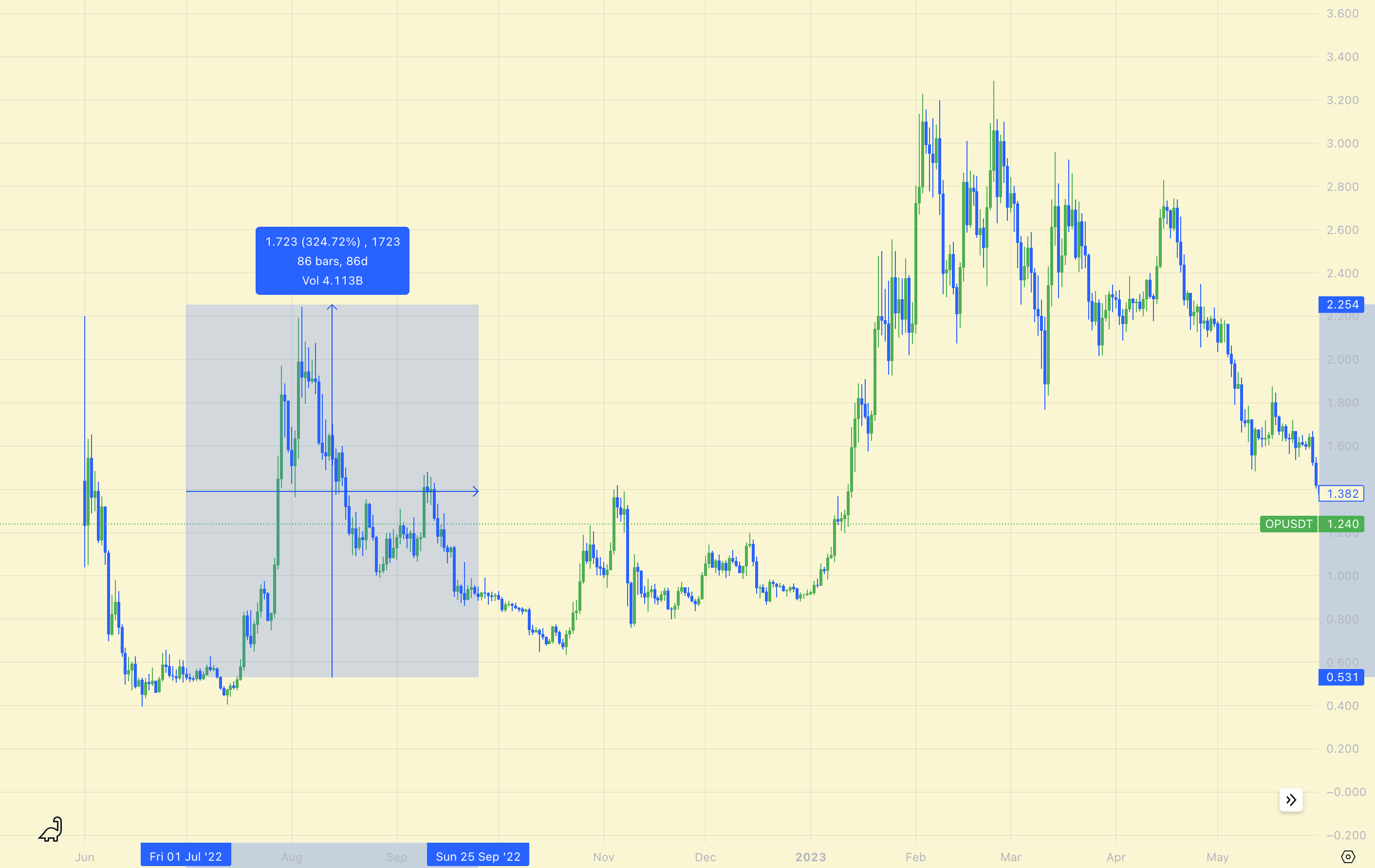 42m OP began distributing July 2022. At the time, the price of OP was $0.5. In the months after the grant distribution started, the TVL on Optimism grew by over $600m reaching more than a billion dollars as seen per the image below. In the same period, OP rallied over 300% before consolidating back to the lows (image 2). It’s worth noting that $ETH went from $1000 to $2000 in the same period so the uptrend should also be attributed to general market bullishness. Nonetheless, OP (+324%) as well as Optimism native tokens like VELO (+1200%) and LYRA (+600%) outperformed the market and ETH by orders of magnitude. It’s likely that the incentive program played a role in this.