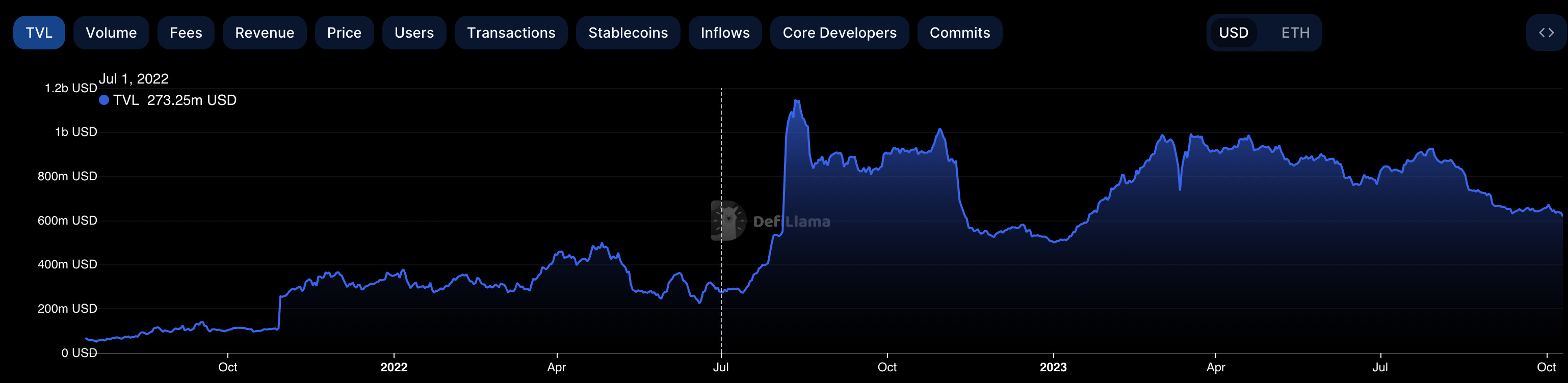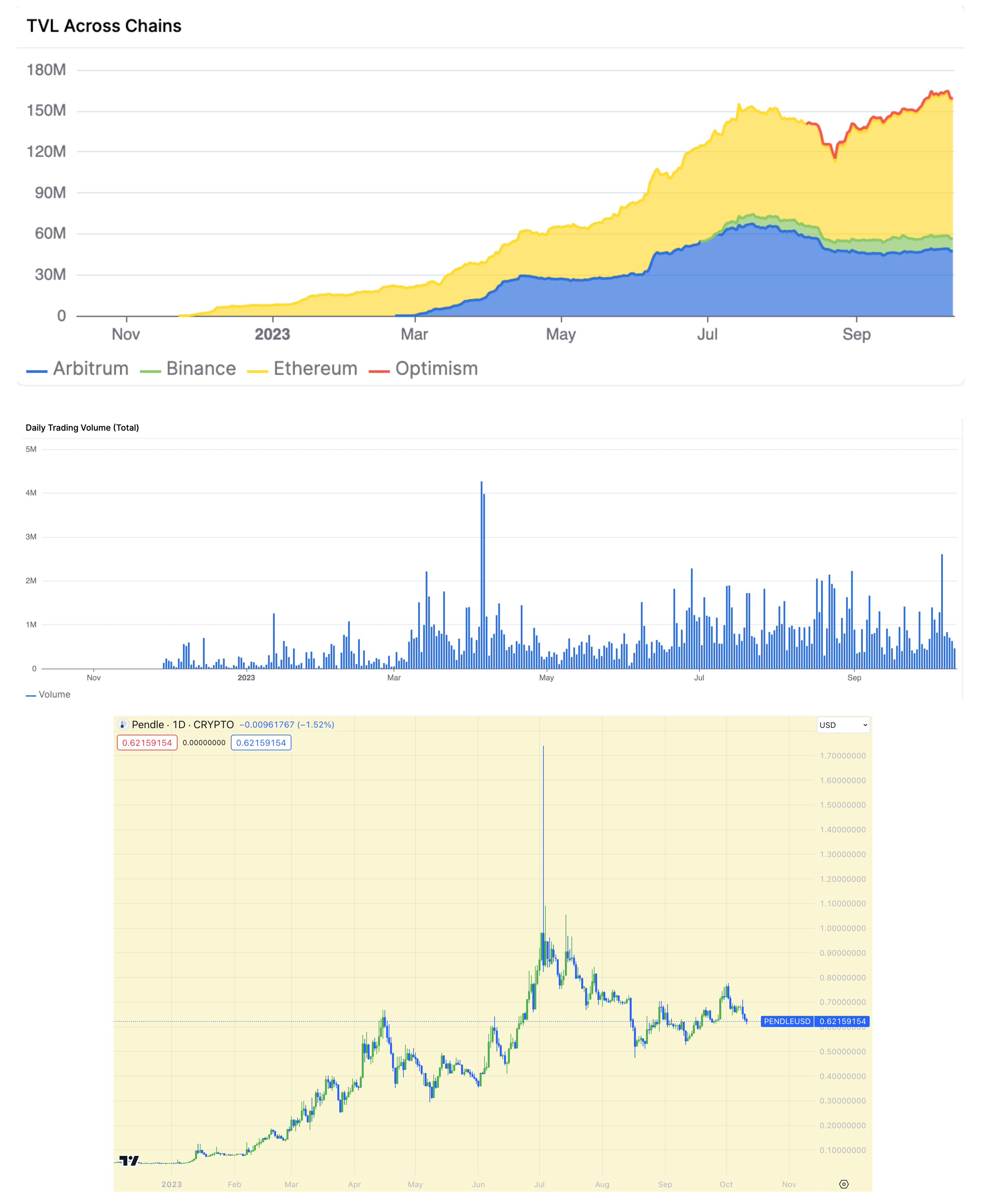 Pendle stats can be viewed here, noteworthy however is the high trading activity still happening on the platform. Most volumes across decentralized trading protocols are at yearly lows while the trading volume on Pendle continues to be at highs. The token price is currently at 60 cents (down 65% from the highs on the day of the Binance listing) and sits at a market cap of $59m. While it’s important to keep in mind that $PENDLE is emitted to incentivize liquidity, it’s clear that the price correlates with the TVL. If Pendle is able to keep growing its TVL, the token could appreciate on a higher time frame.