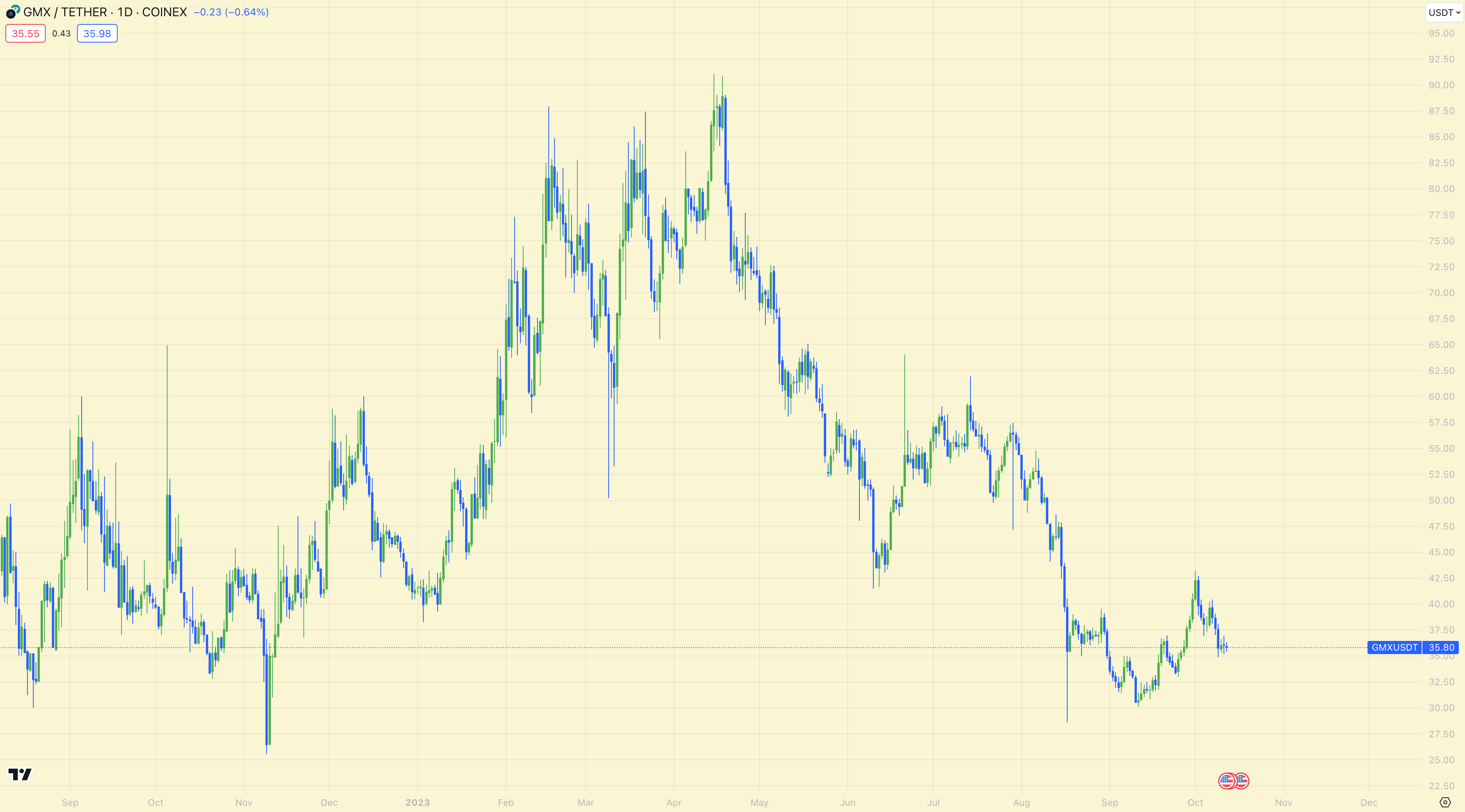 The trading volume and by extension the fees are down significantly from earlier this year. This most likely is a product of a less volatile environment with volume having decreased across the entire market but also the emergence of competitors like Synthetix, Vela, Level, Vertex etc. The price of GMX has also taken a beating and is down 60% from the all time high at $91.