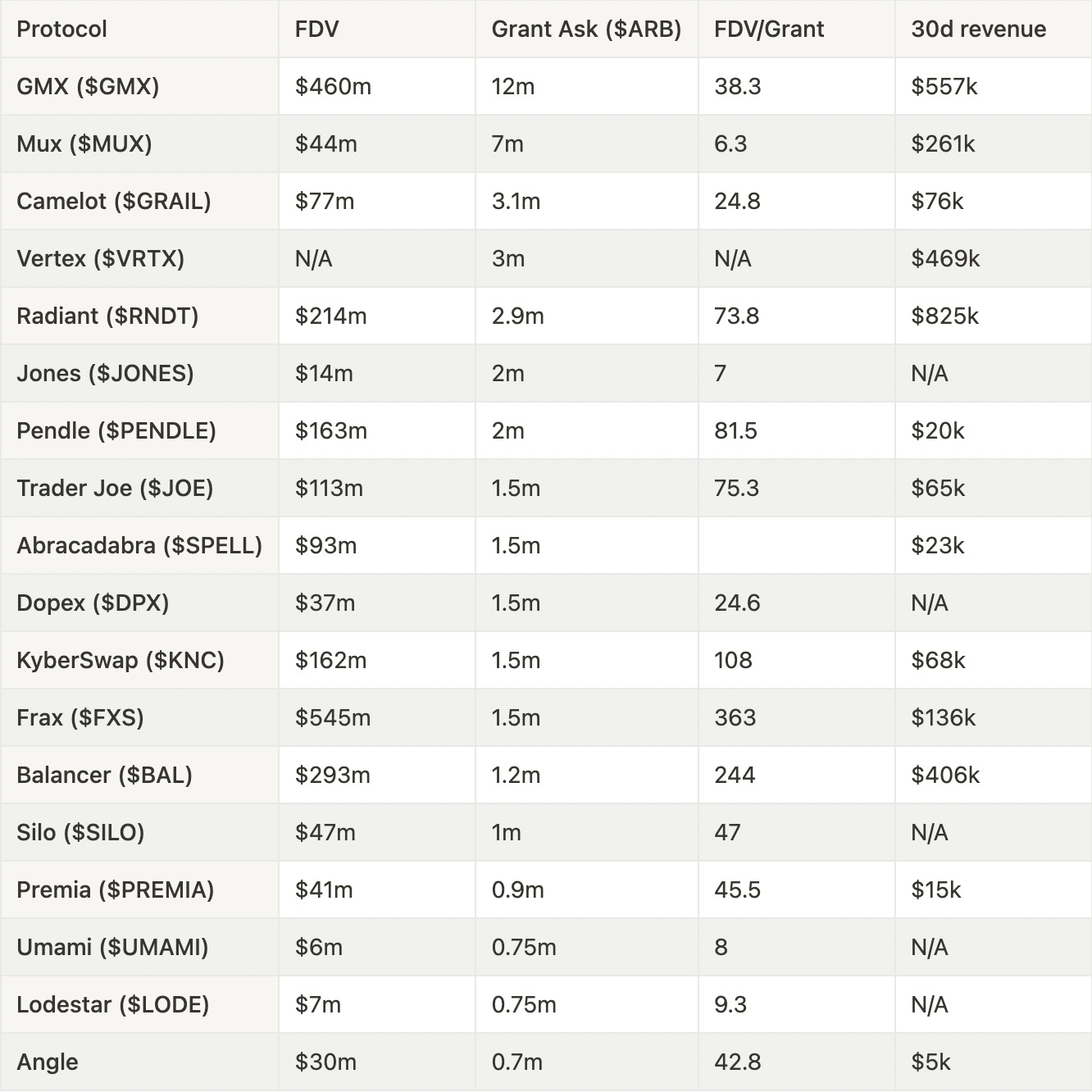 Below is a table of all the larger winning protocols, their respective grant proposals, FDV, FDV/grant and 30d revenue. The lower the FDV/grant ratio, the more $ARB these protocols are receiving relative to their valuation.
