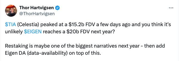 Today, with nearly $11b deposited into EigenLayer and 30+ large applications already committed to being secured by restaking, a $20b $EIGEN valuation is deemed to be conservative and some are calling for $40-$50b FDV.