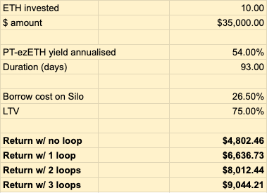 You can also take the other side of this trade by buying the PT-ezETH token which grants a fixed yield on the asset but makes you give up the yield and the ability to farm points. For lower gas fees, I’d suggest depositing into the Arbitrum PT-ezETH market which nets a fixed yield of 54% for the next 93 days. On top of this, you can loop this on Silo Finance where you deposit PT-ezETH, borrow ETH which costs 26.5% annually, convert that into more PT-ezETH and repeat. The math is displayed below but keep in mind that the borrow rate on Silo can be highly volatile. With PT tokens, you keep your initial deposit so the return you see below is on top of the $35k that you keep after the maturation of the market.
