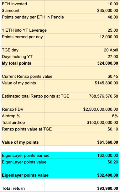Below are the calculations of depositing 10 ETH into YT-ezETH on Pendle (shoutout to Pendle Intern for bringing this to my attention).