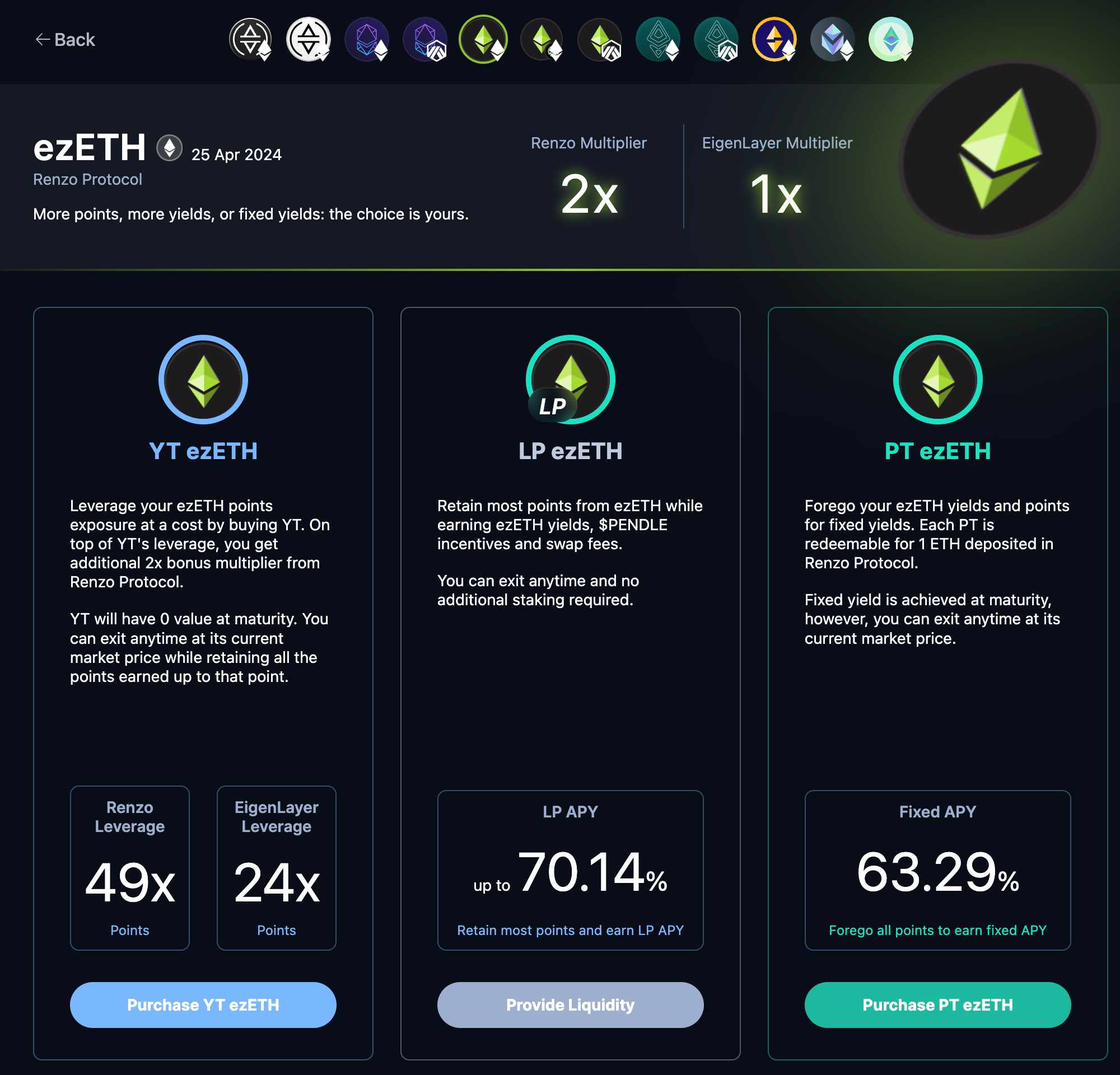 We have established that Renzo likely is the best place to park your ETH for maximizing your LRT airdrop return. On top of simply holding Renzo’s LRT, ezETH, which earns 24 points per day per ETH deposited, you can get leveraged exposure via Pendle. The intricate mechanics of Pendle can be fairly complicated to grasp and require a standalone report but what you should now is that in relation to LRT’s, Pendle can offer either: