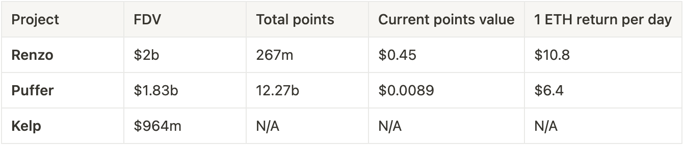 Anyways, given the current number of total points and the estimated FDV, the current Renzo points value is $0.45 and $0.0089 for Puffer. Given 1 ETH earns 24 Renzo points or 720 Puffer points it seems that Renzo is the best place to park your ETH at the moment. Remember that you are also earning $EIGEN points on top of this, which are valued at $0.2 per point at the moment. Finally, keep in mind that these values drop over time as more points are emitted to depositors.