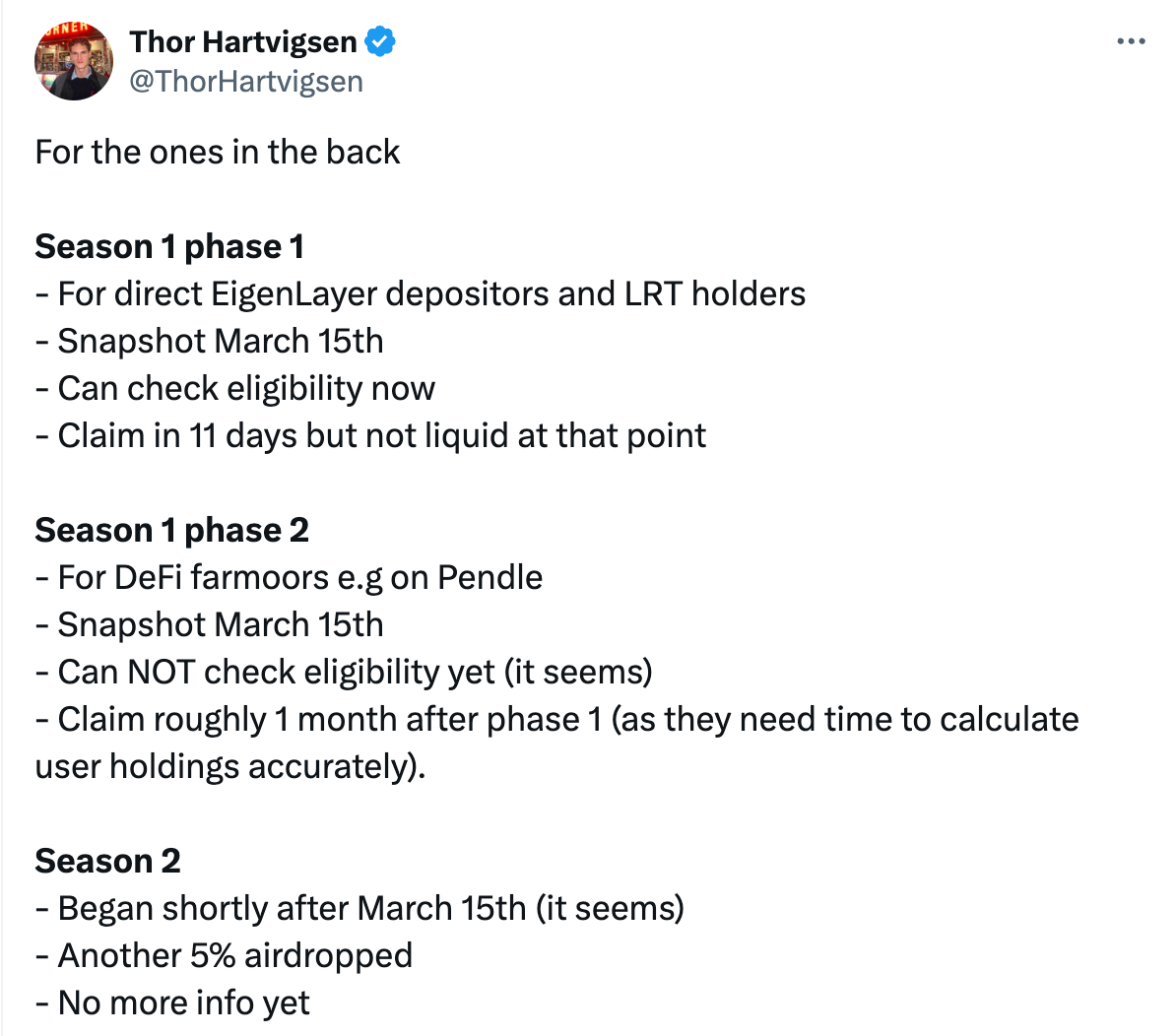 Yesterday, EigenLayer announced the launch and initial distribution of the $EIGEN token. A total of 15% of the total token supply has been set aside for airdrops to EigenLayer stakers in which one third (5%) is distributed in the first season. The announcement was met with a lot of confusion from the community due to the vague description of the initial distribution. In short, it looks as following: