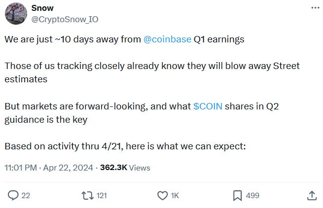 Coinbase is set to release its Q1 2024 financial earnings on May 2 2024. With the bull market back in swing and trading volumes through the roof, analysts are expecting earnings and revenue to be the highest it has been since 2021. In Q4 2023, Coinbase hit profitibality of 273M for first time since the 2022 bear, after its stock rallied 555% to 218.16 today from its bottoms of 33.26 in Jan 2023.