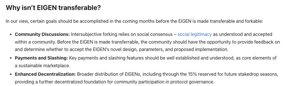 Furthermore, from the EigenLayer docs, it appears that the token will be non-transferable for a few months and potentially not liquid/sellable until after all 15% of the supply has been airdropped (see image below).