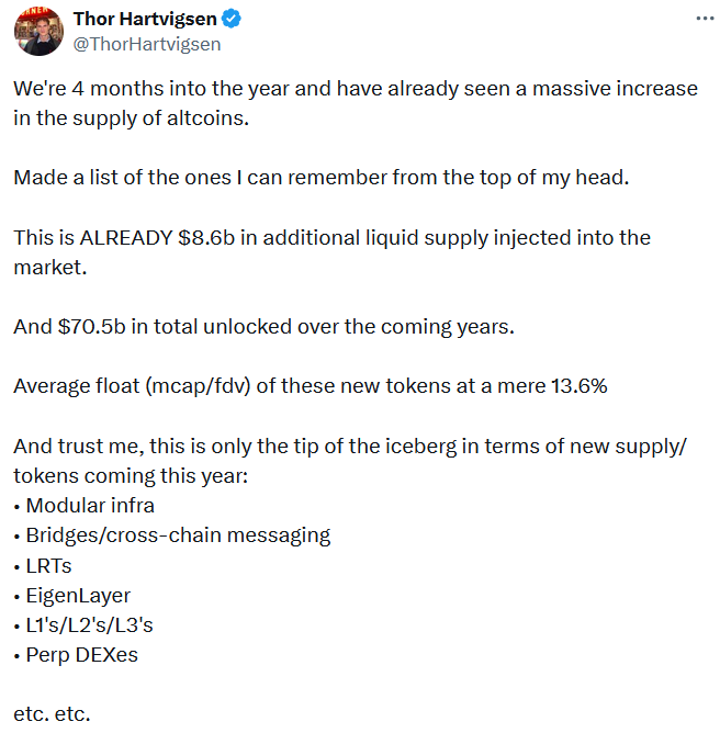 There is a bleak outlook in the altcoin market as many investors on CT are catching on to a massive increase in altcoin supply, with already 8.6B supply injected into the market just four months into 2024. A large amount of this supply is coming from the end of cliffs for 2023 altcoins. Total inflows into crypto are not offsetting this massive altcoin supply coming onto the market.