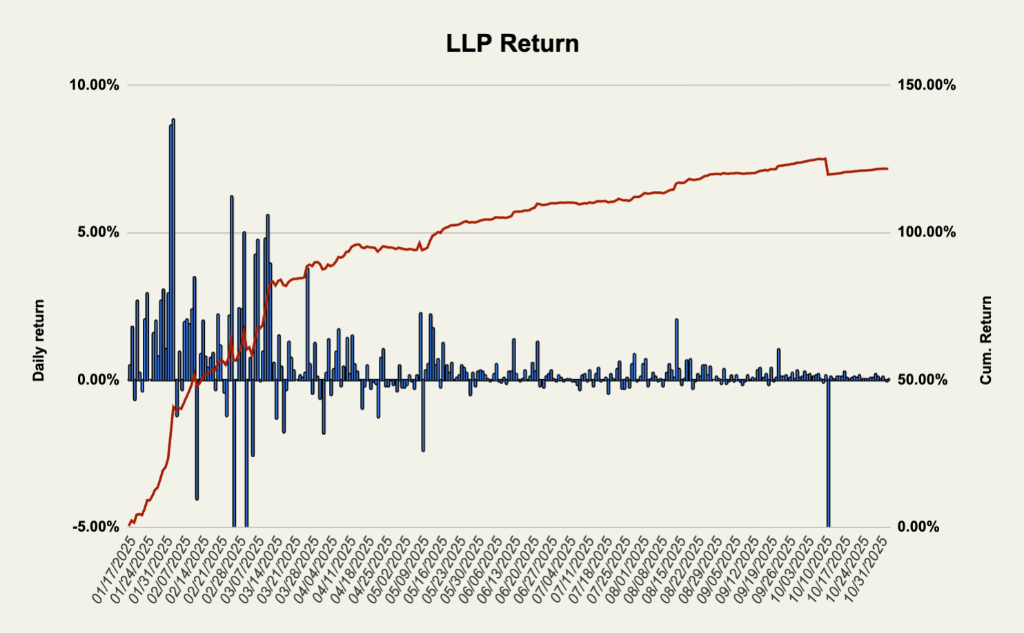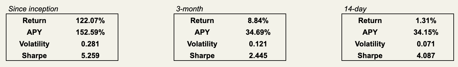 Despite this, LLP still managed to perform fairly well across most timeframes. Roughly 34% APY on both a 3-month and 2-week timeframe with a cumulative return of 122% since inception.