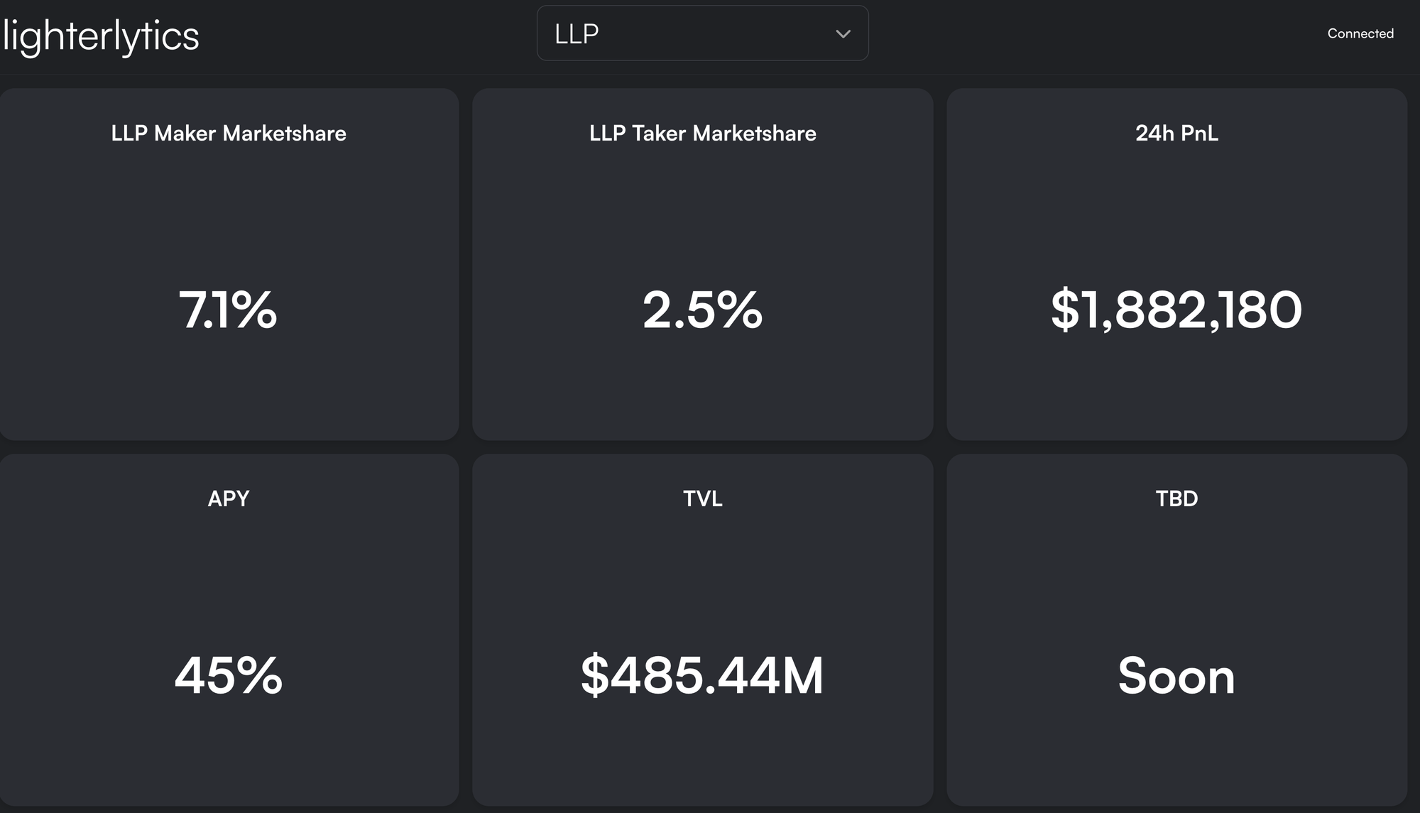 Since May, a lot has changed in how LLP operates. Lighter has onboarded a lot of larger market makers over the past months and as a result, LLP mostly acts as a liquidity backstop today (having gone from 80% maker market share down to ~7% currently).