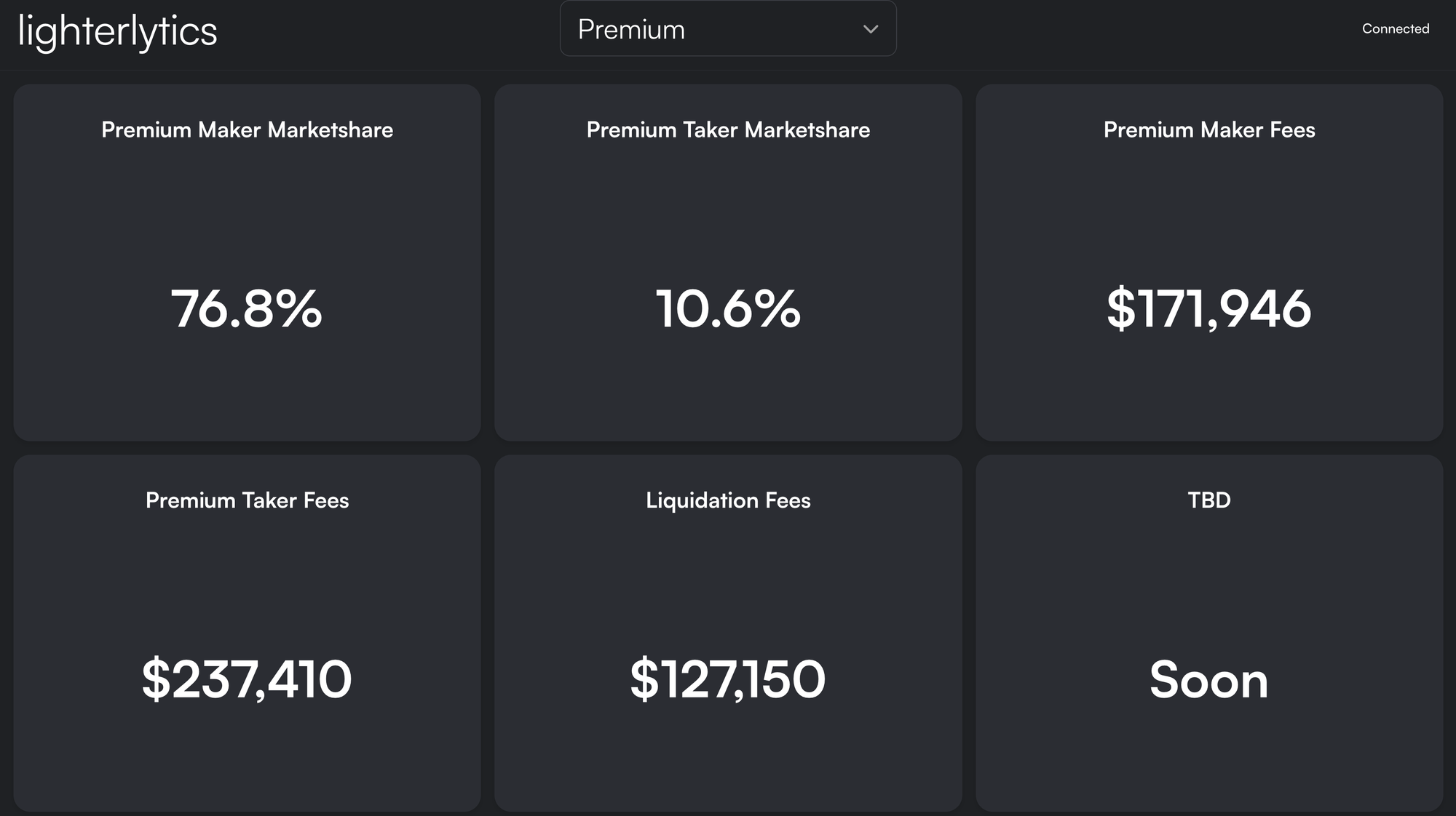 In comparison, in the past 2 weeks, HLP PnL is close to $0 and thus 0% APY. Despite LLP only accounting for 7% of the maker market share on Lighter, LLP is able to offer such a high yield on nearly $500m in deposits. This is largely because the vault currently receives most of the revenue generated by the exchange. According to community created analytics pages like lighterlytics, Lighter does ~$500k on average in daily revenue. This revenue comes from the 1% liquidation fee paid by all users as well as premium users paying trading fees on both maker and taker orders. Note that the revenue numbers are estimates as the team hasn't published exact revenue numbers. It's clear however that the revenue distribution plays a big role in the strong LLP performance.