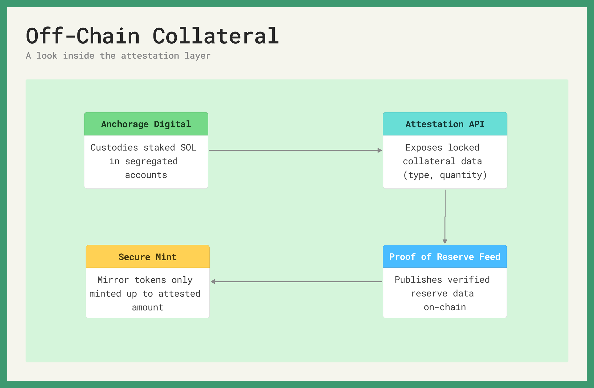 The bridge between custodied reality and onchain representation is Chainlink's attestation layer, that enables continuous verification of collateral held by Anchorage on behalf of each borrower. This evidence is ultimately what gives the mirror tokens their legitimacy within the lending market. Without it, they're just plain IOU's backed by the middleman's good faith and nothing else. With it, they carry the economic weight of staked SOL, including the staking rewards that accrue periodically.