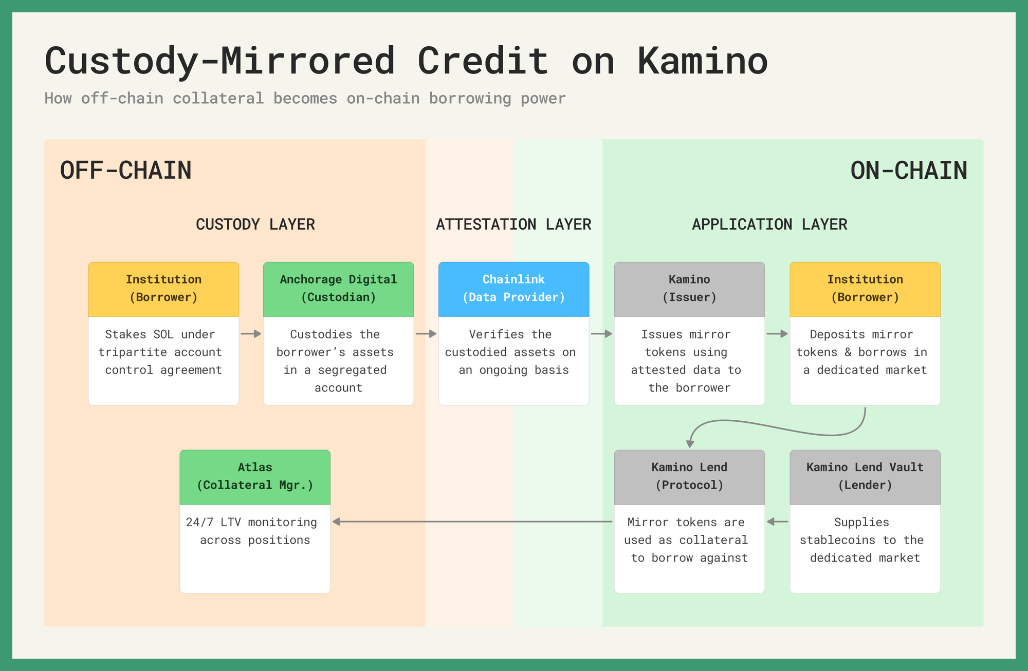 In practice, an institutional entity stakes SOL with Anchorage Digital Bank, where it sits in a segregated account under a tripartite account control agreement. Chainlink attests to the custodied value on an ongoing basis. Mirror tokens backed by the aforementioned assets are issued and can be freely borrowed against in a dedicated Kamino Lend market. All positions are then actively monitored and managed by Atlas. At every point in this process, each action is innately auditable.