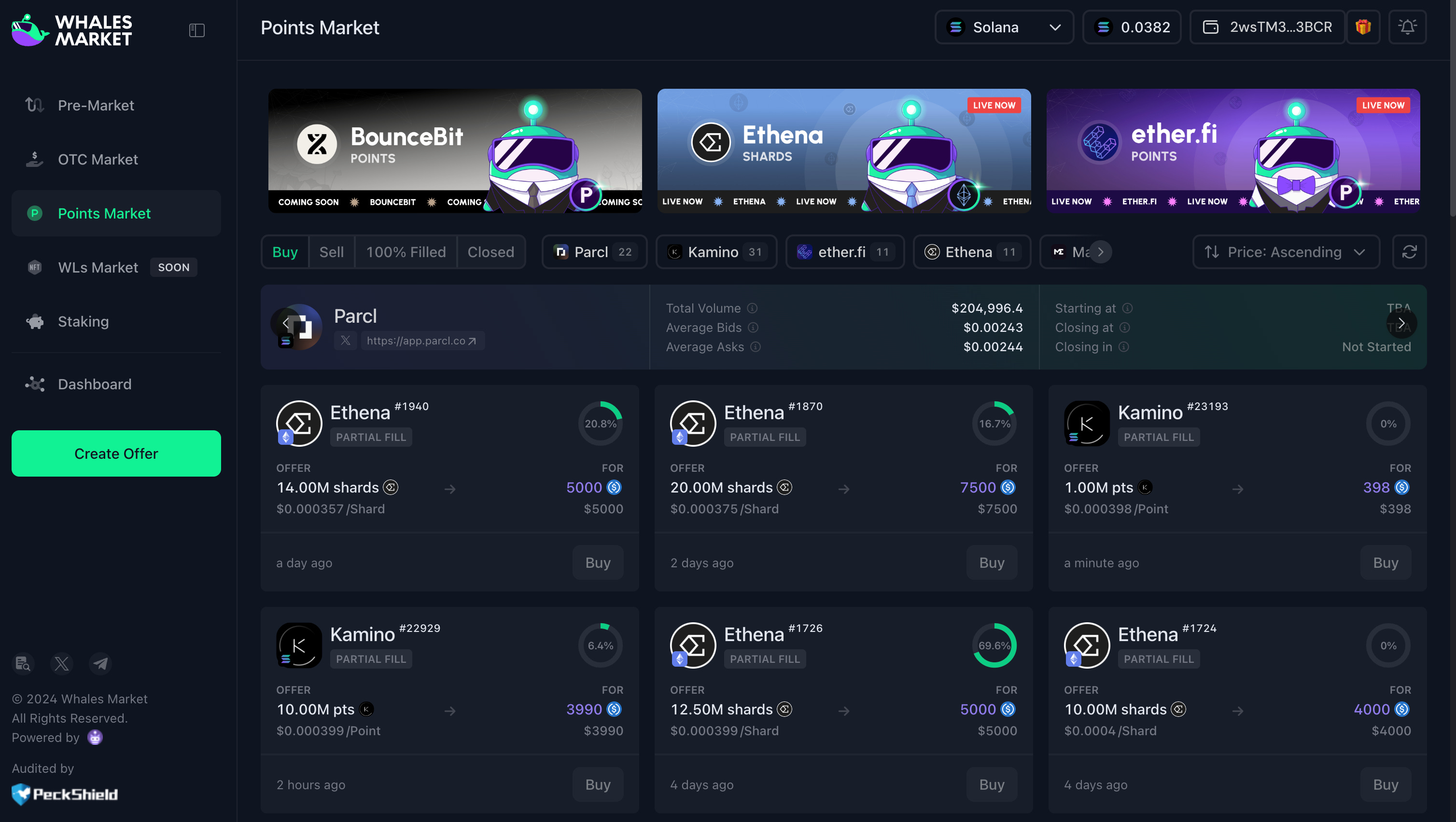 There are currently 9 protocols whose points can be actively traded on the platform: Parcl, Kamino, Ethena, Magic Eden, Hyperliquid, EigenLayer, friend.tech and ether.fi. In the near future Marginfi, Drift and Blast should be available as well.