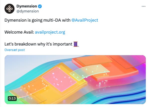 Dymension ~ Dymension is a Cosmos chain powering ‘Rollapps‘, a standardized template for modular rollups built on top of the Dymension hub and powered by the Cosmos IBC bridge. Rollapps settle on Dymension but use non-native data-availability solutions. Dymension initially partnered with Celestia for DA (and airdropped DYM to TIA stakers) but has since gone ‘multi-DA‘ by partnering with Avail as well.