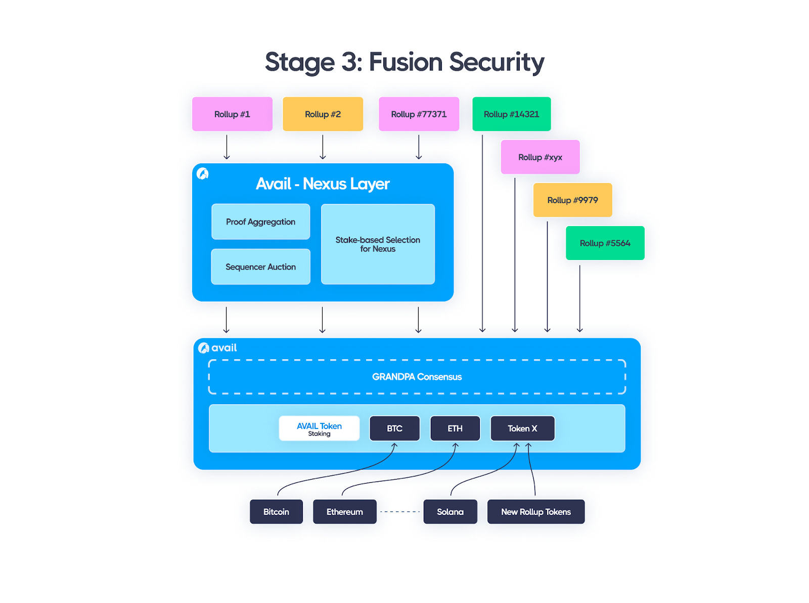 Fusion allows base-layer tokens like BTC, ETH, SOL and more to contribute to the Avail consensus in addition to $AVAIL. Rollups building on top of Avail are in addition able to help secure the Avail base layer with their own token. By allowing multiple different tokens to contribute to the security of Avail, the economic security has the potential to be magnitudes higher than other modular tech stacks.