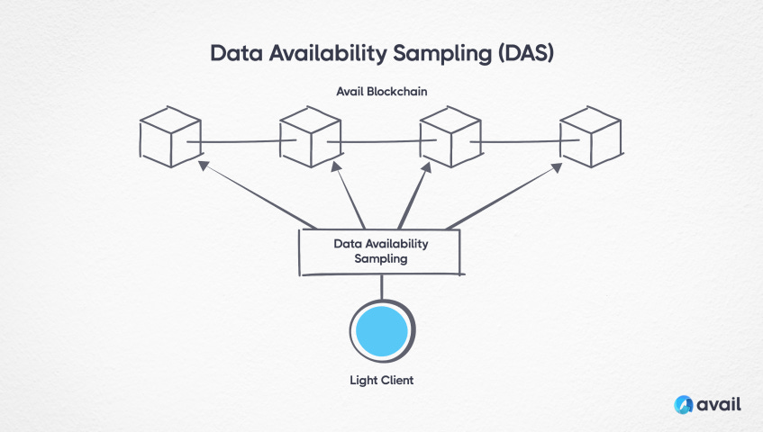 Data availability sampling (DAS) is a method used by light clients to scan the data and ensure that it is available without having to download all of it. In short, light nodes take samples of the data from the Avail blockchain and for every sample taken, the probability of the data being correct increases significantly. Within 8-30 samples the data availability guarantees reach close to 100%.