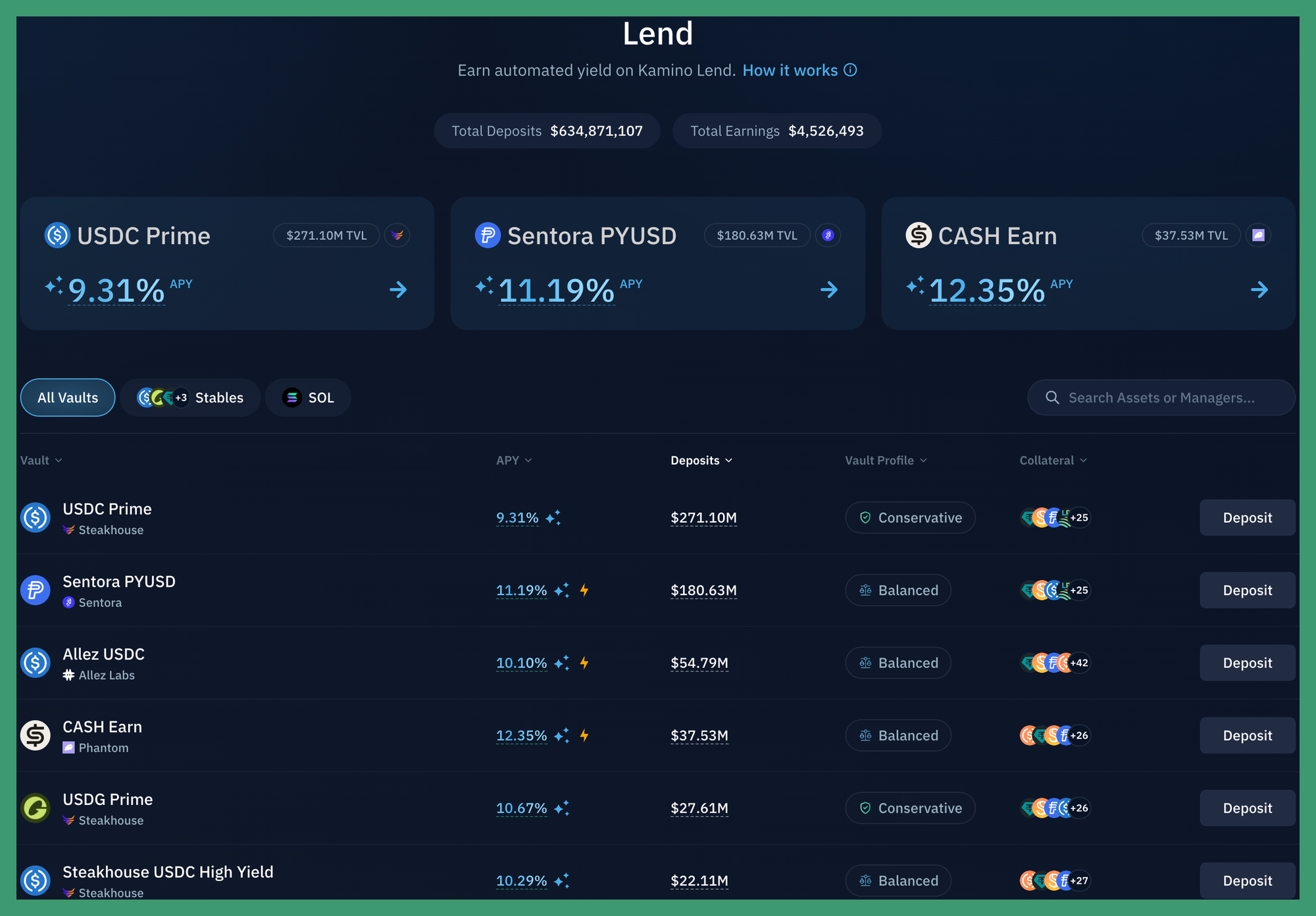 A large contributor to its recent growth has been the project's automated lending layer, launched as part of the V2 upgrade earlier this year. Kamino Lend offers some of the highest liquid stablecoin yields curated by reputable vault managers. These vaults provide liquidity across various native markets and have gathered over $600 million in deposits with more than $4.5 million paid out in yield to lenders thus far.