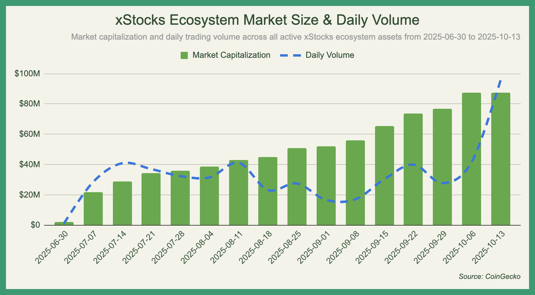 While not nearly as popular as real-world-assets (RWAs), tokenized equities have gradually gained momentum despite regulatory and custodial hurdles, with xStocks at the forefront. As liquidity deepens from increasing capital shifting towards the shares of prominent publicly traded US companies, on-chain spot exposure to stocks is becoming more feasible and cost-efficient than before. Since the time we first time we covered the ecosystem on the 27th of July, the total market capitalization has nearly tripled to over $90 million as per CoinGecko.