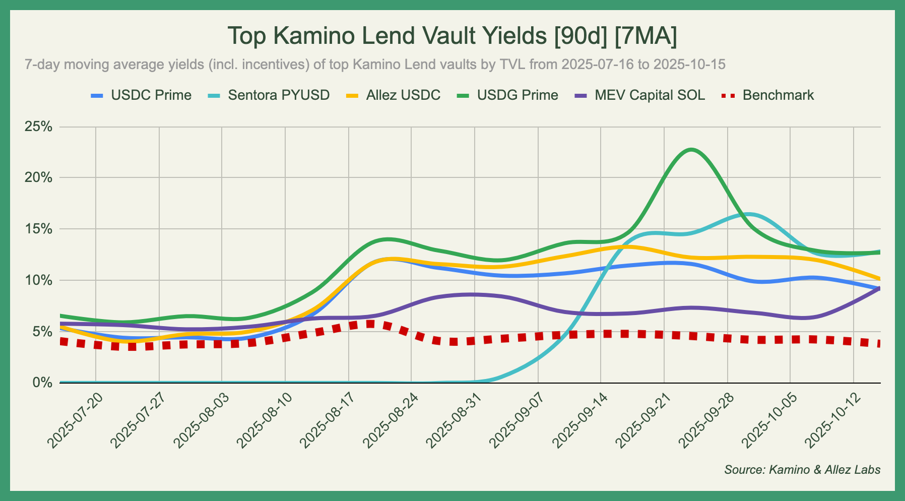 In most cases the KMNO rewards either matched or surpassed the effective yield, shadowing any basis points added by individual market reward and raising the bar for stablecoin returns to well over 10%. PYUSD and USDG maintained a small premium due to their perceived higher risk profile compared to established stablecoins like USDC, with USDG Prime briefly spiking to over 22% in late September before normalizing. While all vaults have since converged closer to the 10-12% range, they continue to offer substantially higher returns than the benchmark (average aggregate stablecoin rate), which has remained relatively flat around 4-5% throughout the period.