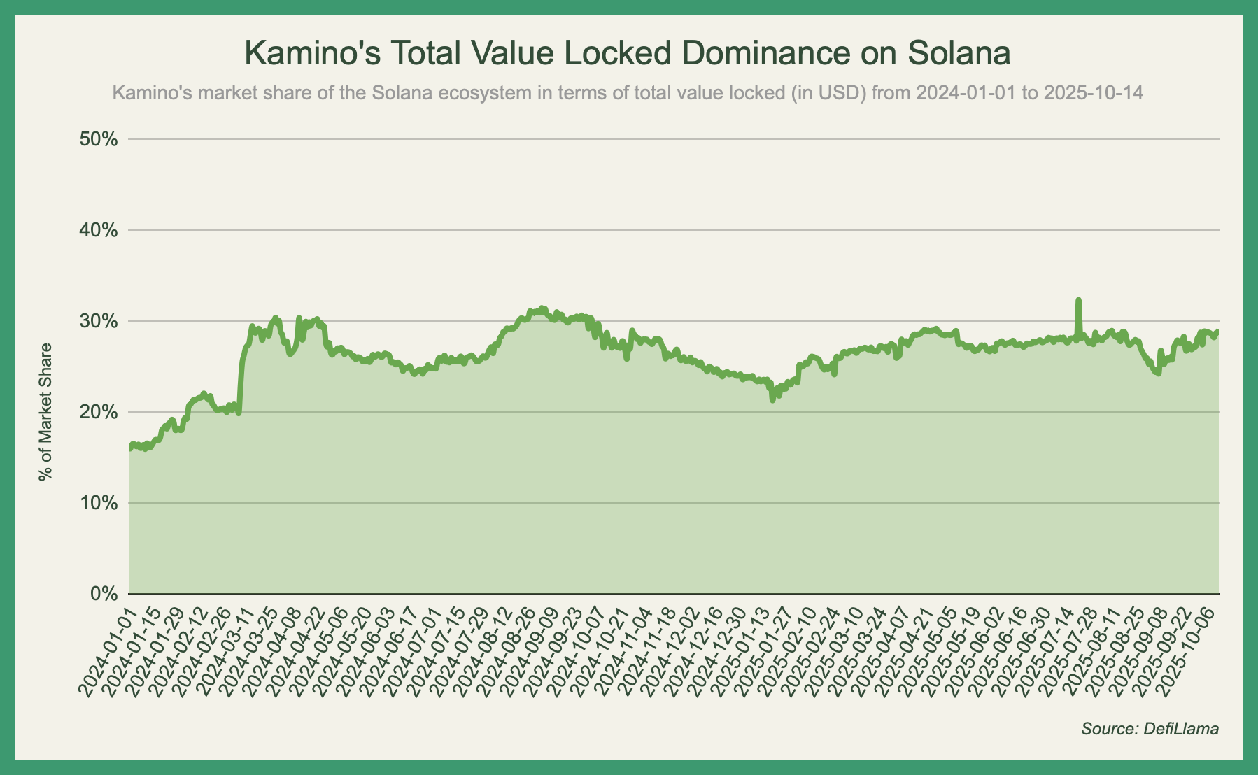 Kamino is the second largest protocol on Solana, not far behind its competitor, Jupiter. For more than a year and a half, Kamino has consistently accounted for 20-30% of the chain's TVL and is also one of the largest (ranked 6th) lending protocols in all of DeFi.