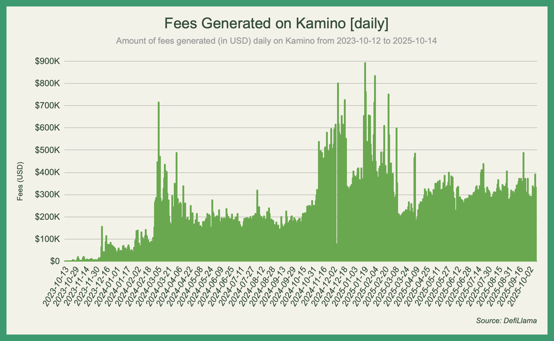 Kamino generates approximately $300,000 in daily fees and currently totals ~$120 million in annualized 30-day fees. Fees are earned from user interactions with Kamino’s products including deposits into vaults, withdrawals, borrowing (interest payments), flash-loan leverage via Kamino Multiply and more. Proceeds are primarily distributed to lenders, with the remainder recorded as revenue. Revenue currently flows to the Kamino treasury, helping cover operating expenses and support the platform's growth.
