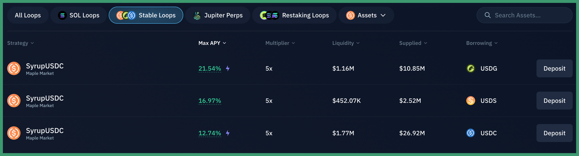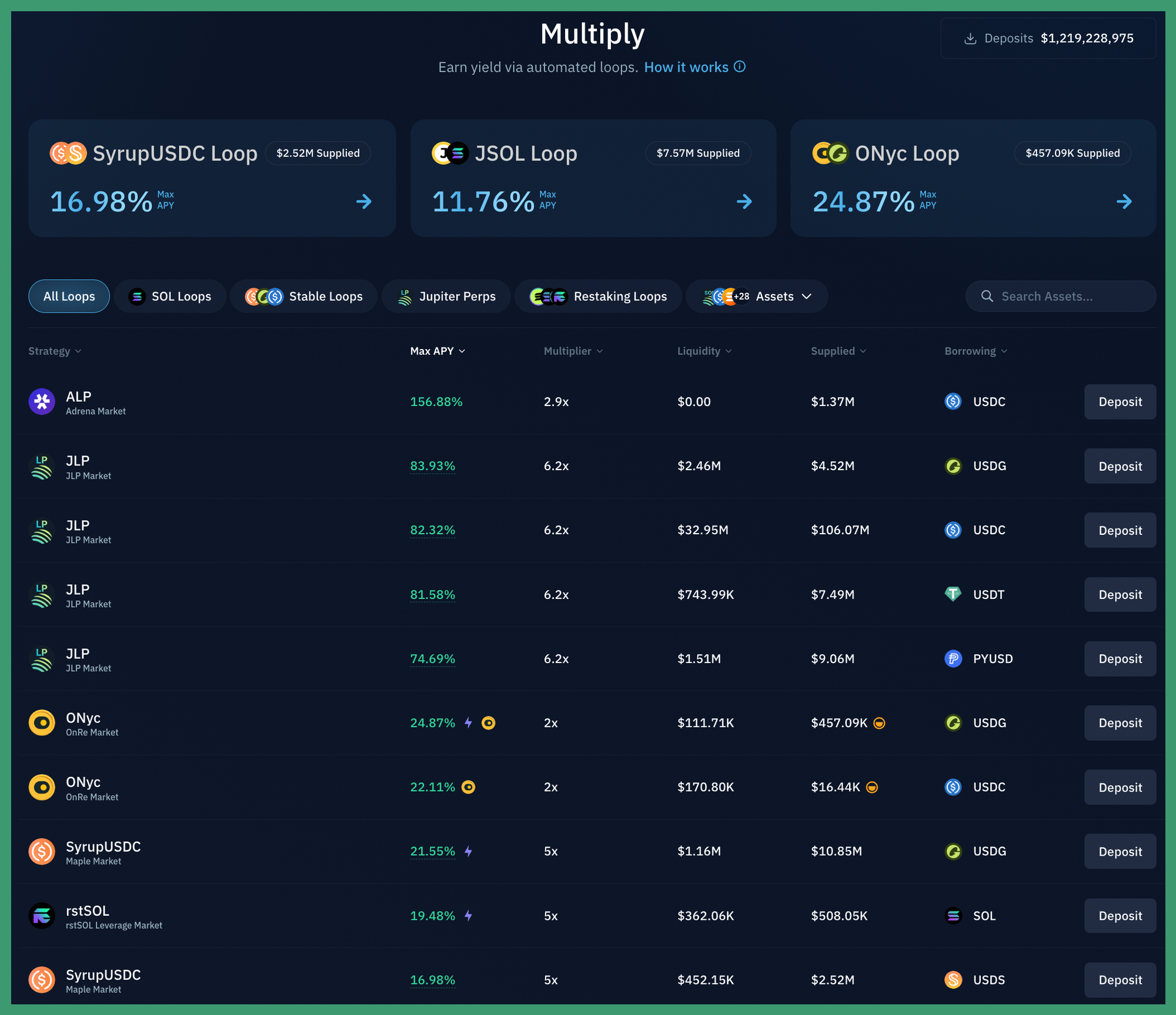 There are various other interesting looping strategies on Kamino right now on assets like SOL (up to ~20% APY) and JLP (>80% APY) all of which can be accessed seamlessly via Kamino Multiply. You can find all of these strategies here.