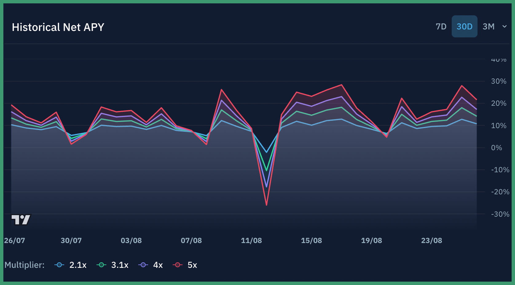 The historical net APY on this market can be viewed below at various levels of leverage used. Keep in mind that this is a pure stablecoin loop which means a lower risk of liquidation. SyrupUSDC on Solana currently offers a 7% yield and with a 3.2% borrow rate on USDG that equals to a total strategy return of 21.5% at 5x leverage.
