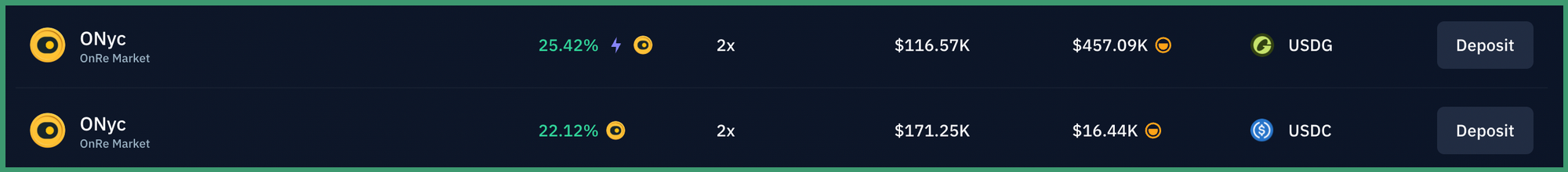 As of now, ONyc yields an APY of 11.8% and since going live on a Kamino market August 5th, it's possible to juice this return by utilizing Kamino Multiply. The token is currently limited to 2x leverage on Kamino Multiply but still yields more than a 25% APY. Liquidity is thinner than on the SyrupUSDC vaults so keep a close eye on the borrow costs as a large deposit could cause the borrow rate to spike up.