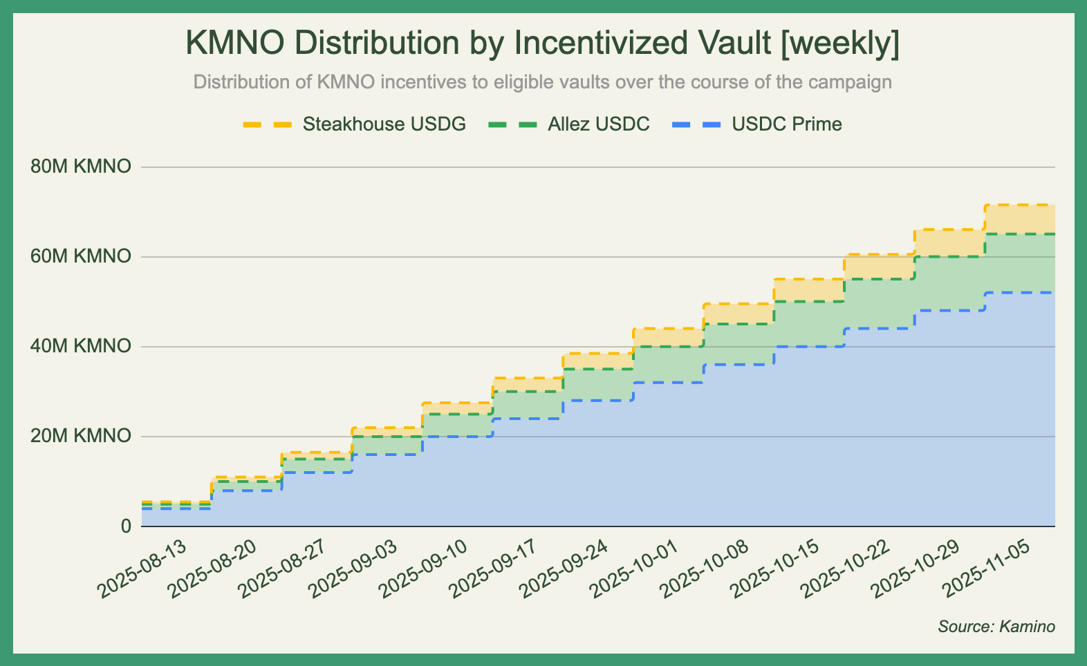 From the 7th of August all the way to the second week of November, up to 100 million locked KMNO tokens will be distributed across three vaults residing on the platform's Earn layer with varying allocations. The decision to make a handful of options eligible for rewards, rather than the entire available market, stems from Kamino's desire to direct more lending activity to vaults curated by reliable operators.