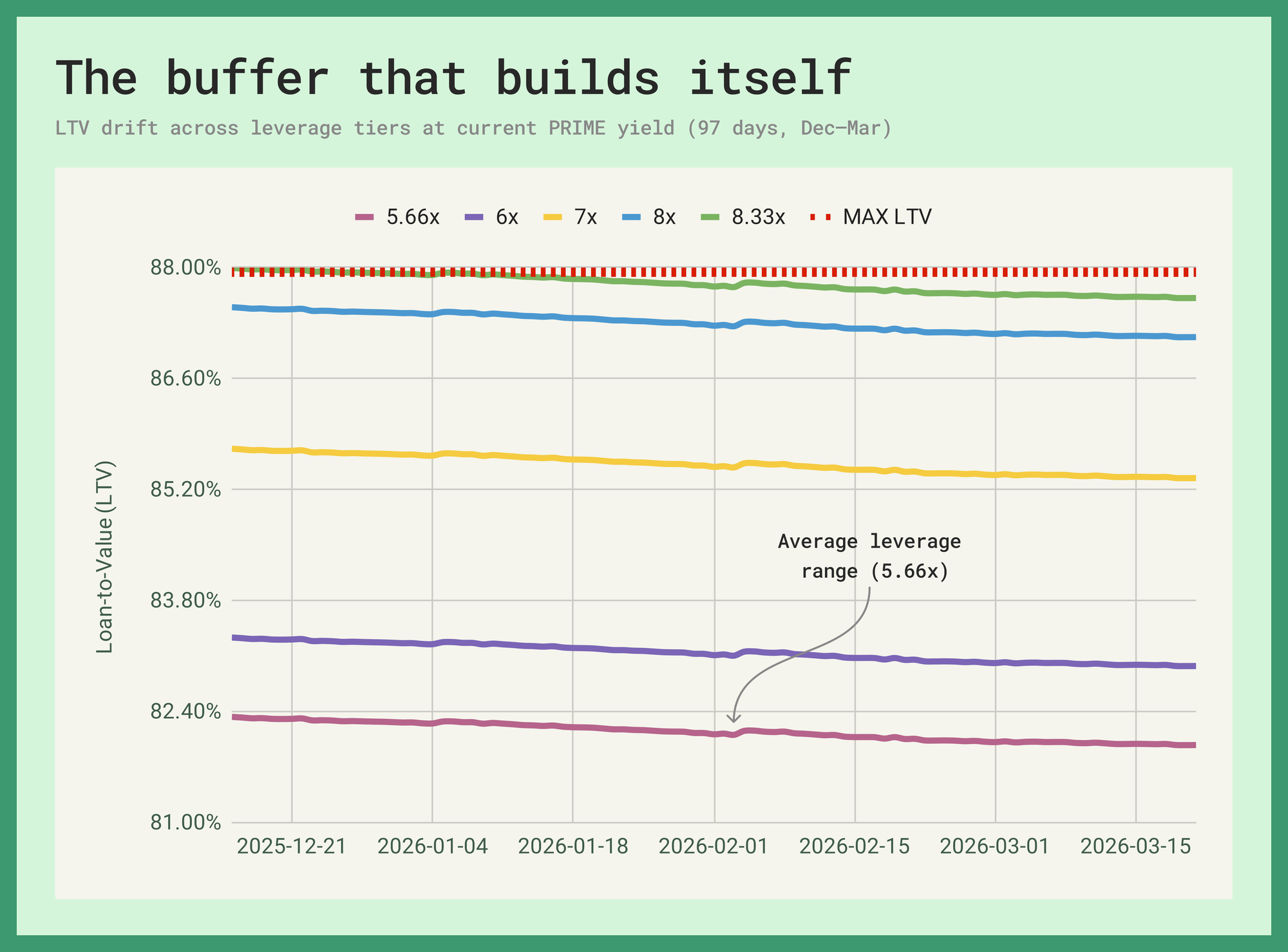 The intuitive assumption, that interest accrual slowly erodes the buffer between current LTV and liquidation is wrong at current rates. We backtested PRIME Multiply positions at 5.66, 6, 7, 8, and 8.33 leverage across all available borrow tokens over 97 days. In every combination, LTV improved. At 8.33x, the average position drifted down to 87.61%, generating 39bps of room from nothing. At 7x, the buffer widened by 28–32bps regardless of the borrow token.