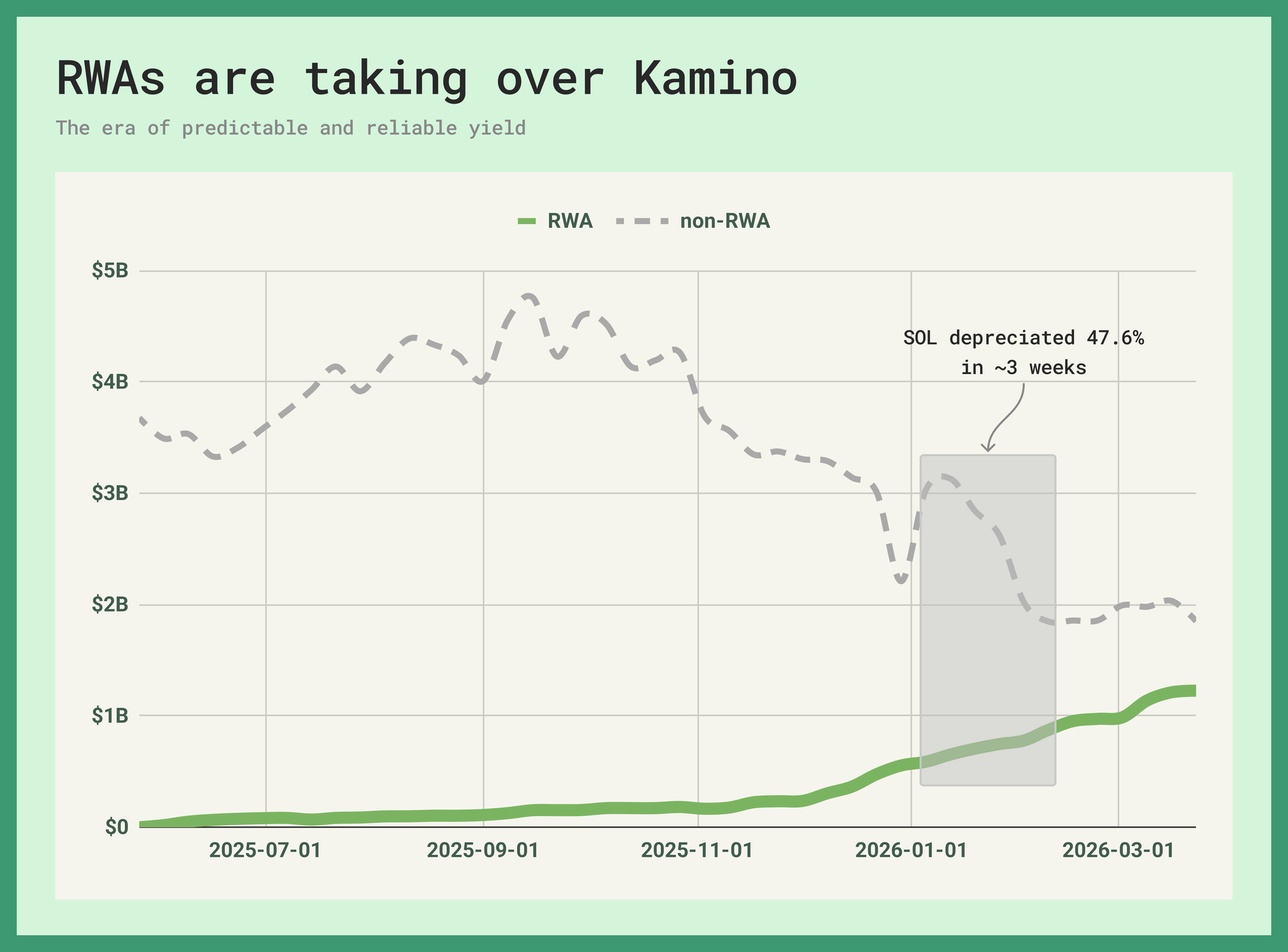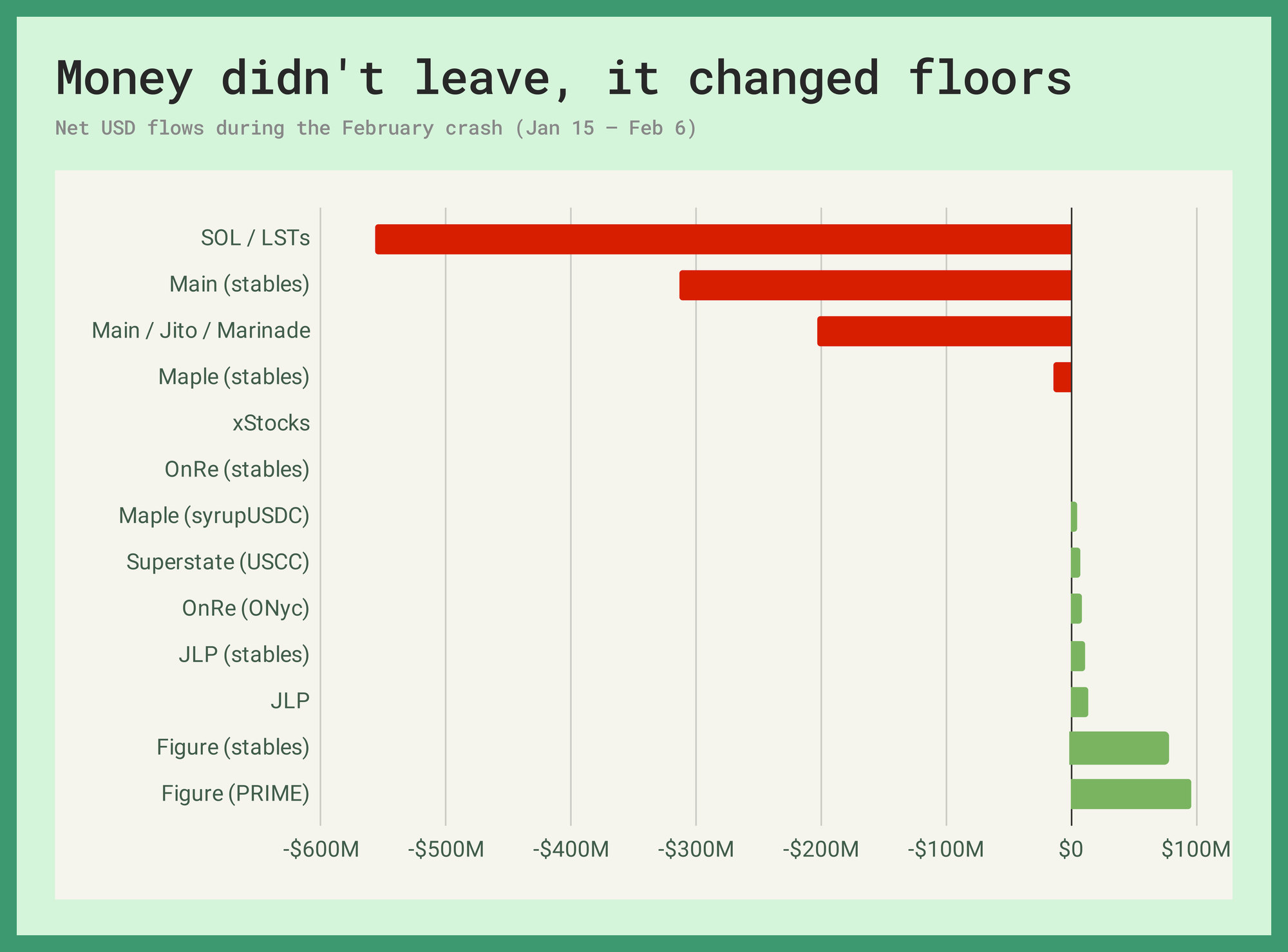 When SOL bled ~47.6% in the span of three weeks between January 15 and February 6, the main market lost roughly $971 million in dollar-denominated value with the native asset and its liquid staking derivatives taking the biggest hit. Even the largest stablecoin pools contracted, with $214 million in PYUSD and $105 million in USDC disappearing. During this period, RWA markets absorbed $173 million in net new deposits. PRIME alone took in $96 million of collateral and $89 million in USDC supply. The OnRe market grew 38% and Superstate 10x'd off a small base.