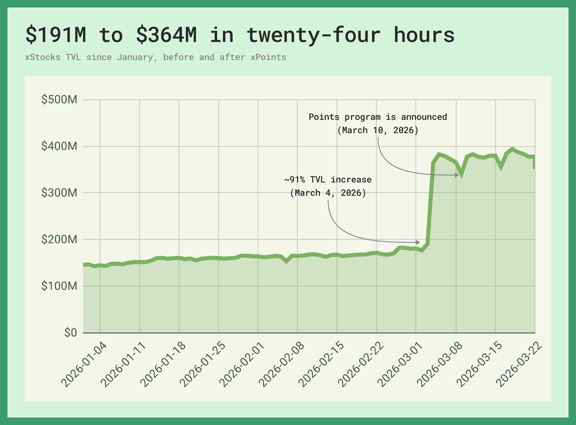 Tokenized equity is a category, not a strategy. xStocks' total value locked doubled from $191 million to $364 million on March 4th. The onchain signature was a programmatic batch mint with roughly 30 previously small xStock tokens each jumping by ~$5 million on the same day.