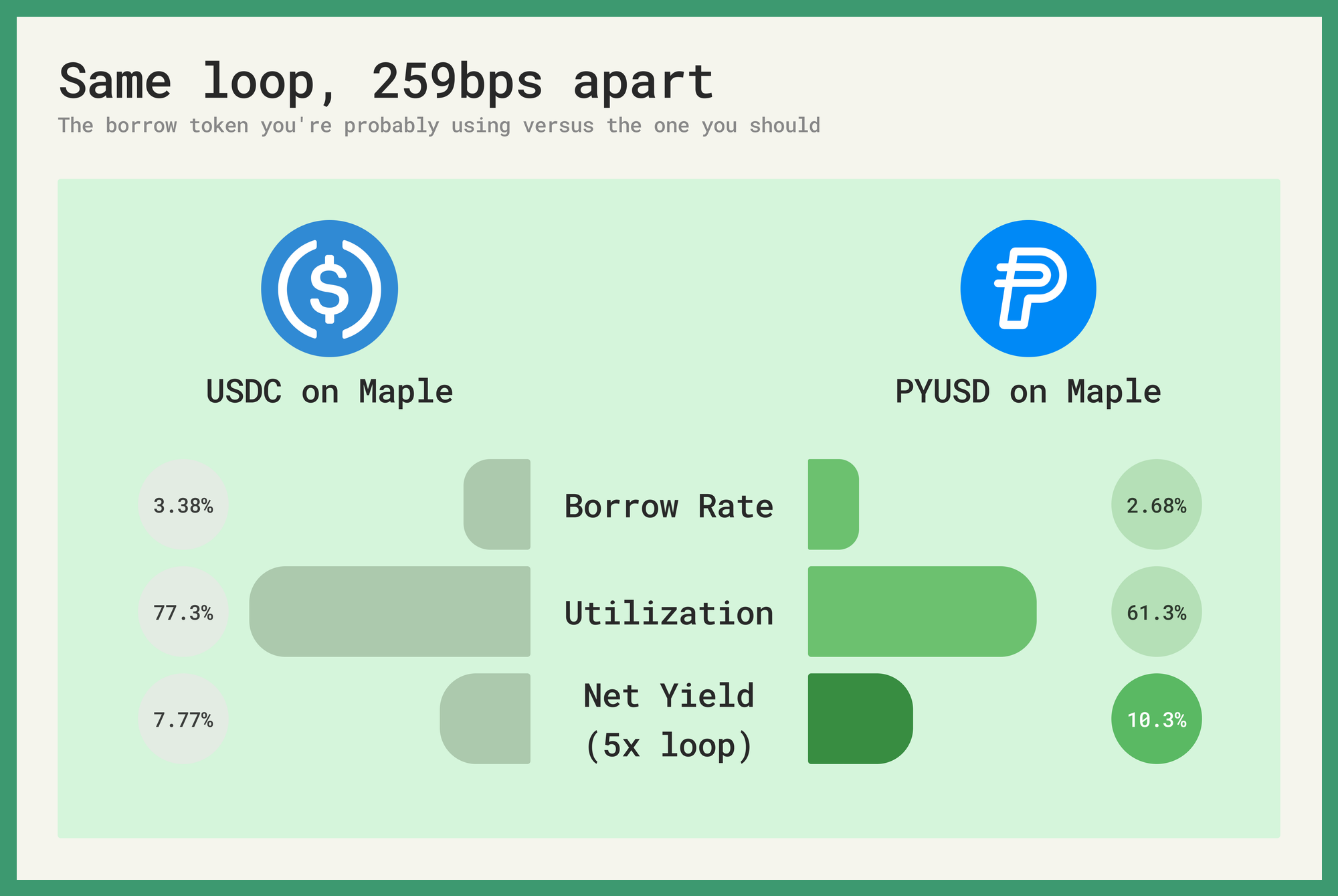 - The Maple PYUSD loop returns 259bps more than USDC at the same leverage — $130.58 million borrowed at 2.68% vs $11.45 million at 3.38%. At 5x: 10.36% net yield on PYUSD, 7.77% on USDC.
