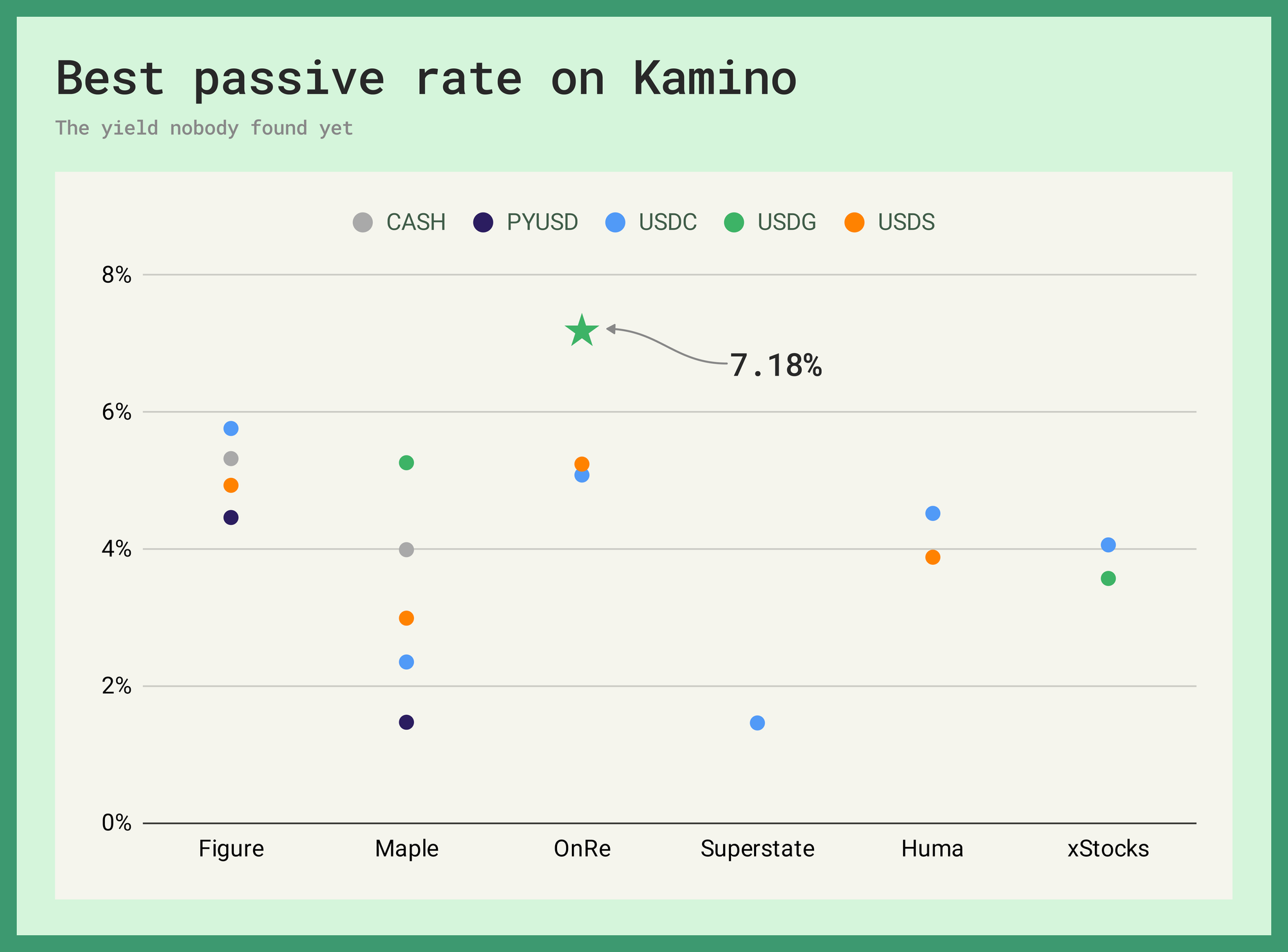 USDG on OnRe is at 93.34% utilization paying 7.18% supply APY on a $16.17 million pool. Across all five markets, all borrow tokens, all lending pools, that is the highest passive lending rate on Kamino. Higher than USDC into PRIME at 5.75%. Higher than anything on Maple.